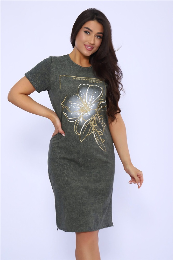 Страна производства: Россия Платье женское укороченное с оригинальным принтом спереди выполнено из кулирки 100% хлопок. Короткий рукав, горловина обработана узким кантом, по бокам разрезы. Платье отлично подойдет как для дома. Так и для прогулок и отдыха.