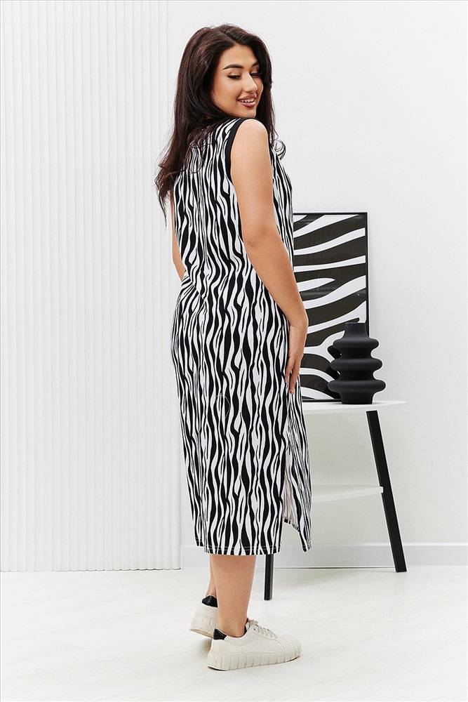 Страна производства: Россия Удлиненное платье-сарафан приталенного силуэта без рукава выполнено из кулирки 100% хлопок оригинальной яркой расцветки. По бокам - разрезы, горловина и проймы обработаны широким кантом. Платье комфортное, идеально подойдет как для дома, так и для отдыха.