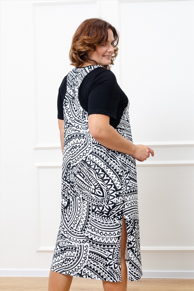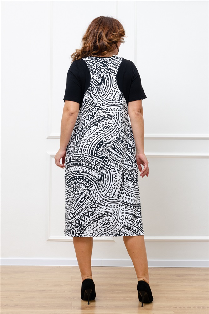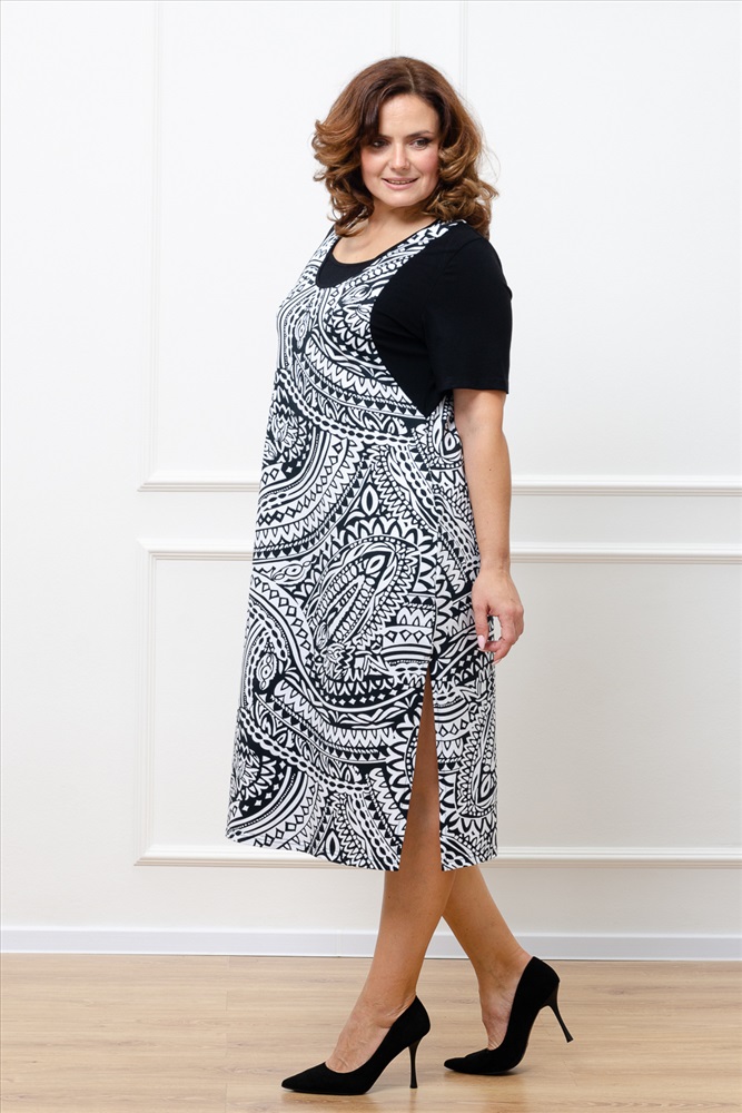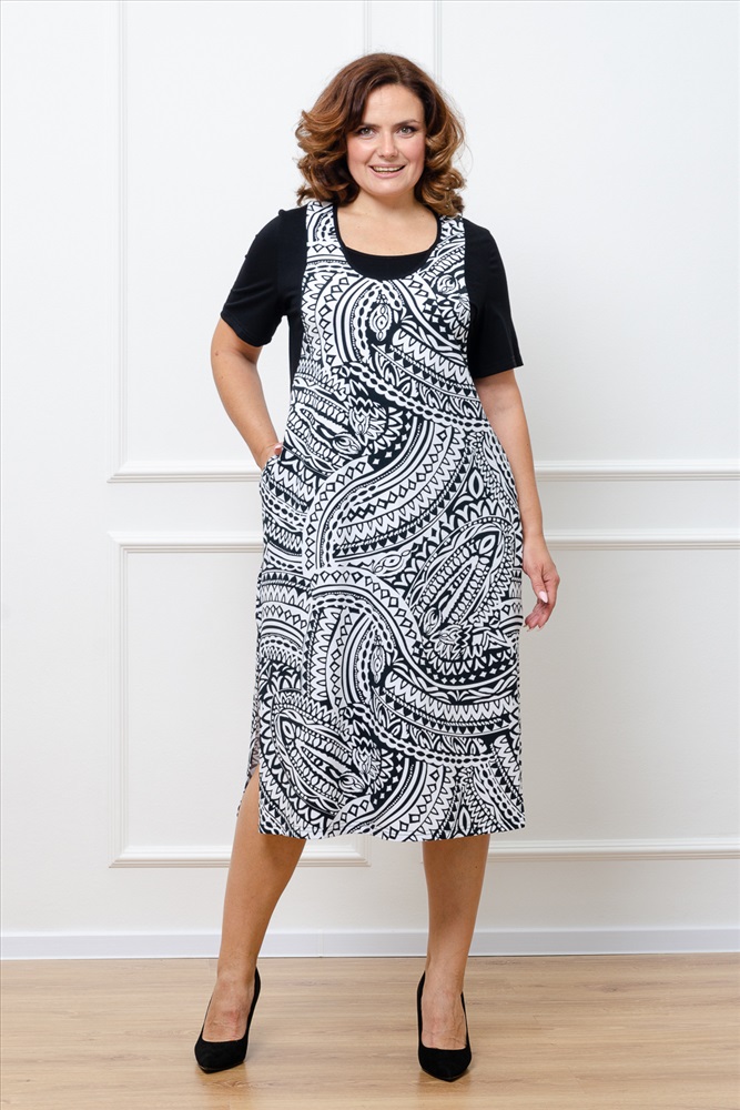 Застежка: без застежки Платье-имитация сарафан+футболка. Силуэт полуприлегающий, длинное, с округлой горловиной, с боковыми карманами. Рукав короткий, из отделочного полотна. Горловина обработана бейкой из отделочного полотна.