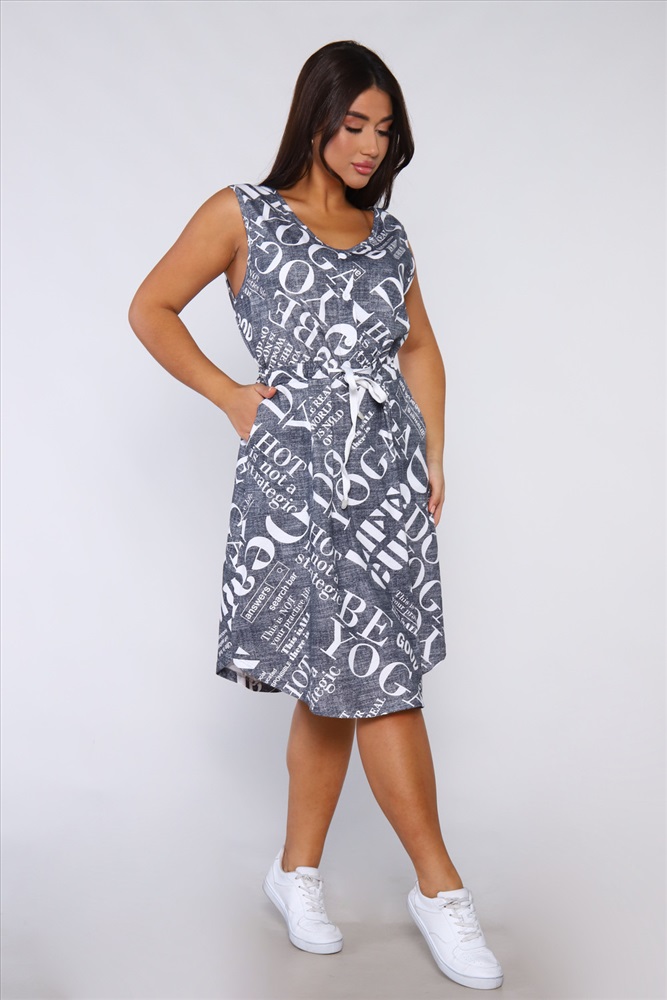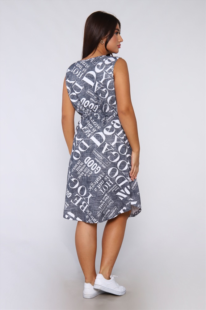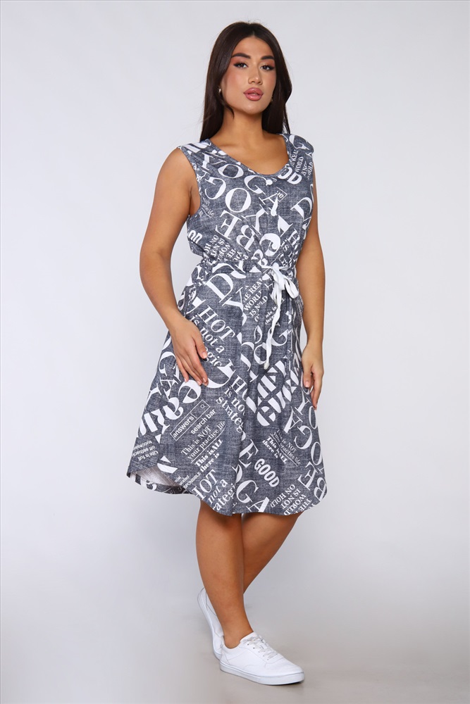 Застежка: без застежки Платье женское без рукавов. Данная модель выполнена из трикотажного полотна кулирка (хлопок 100%). На полочке присутствуют накладные карманы и планка - обманка с пуговицами. Для того чтобы подчеркнуть силуэт в районе талии имеется кулиска. Горловина и пройма обработана окантовкой из основной ткани. Отличная модель для повседневной и домашней носки.