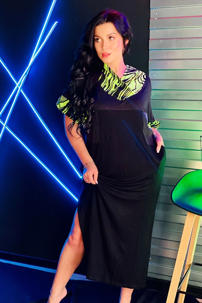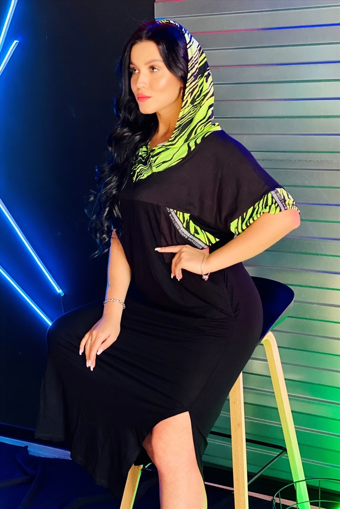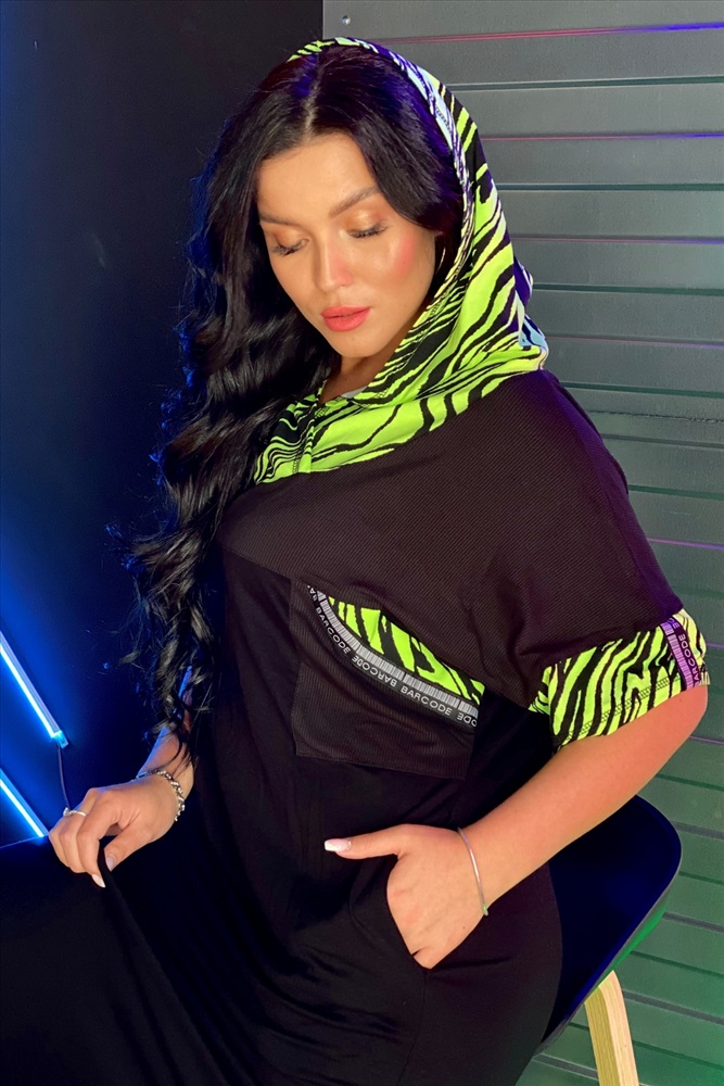 Воротник: с капюшоном Платье женское прямого силуэта с капюшоном. Рукав цельнокроенный короткий со швом. Капюшон, манжеты рукава и обтачки накладных карманов на полочке из отделочной ткани. В боковом шве внутренние карманы. Верхняя часть спинки и полочки, накладные карманы из кашкорсе, нижняя часть платья из плотной вискозы. В боковых швах разрезы.
