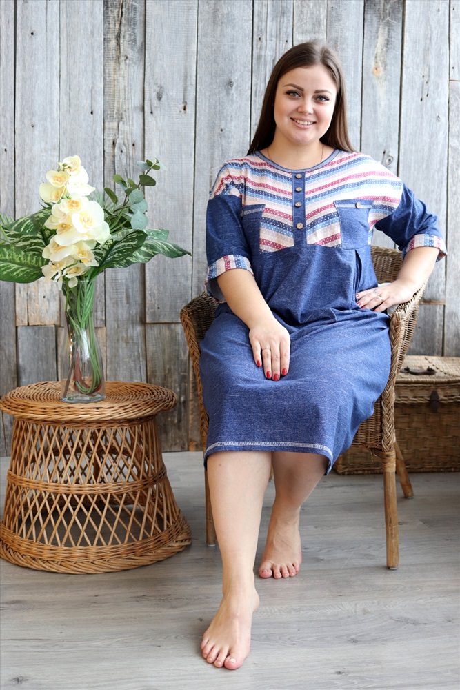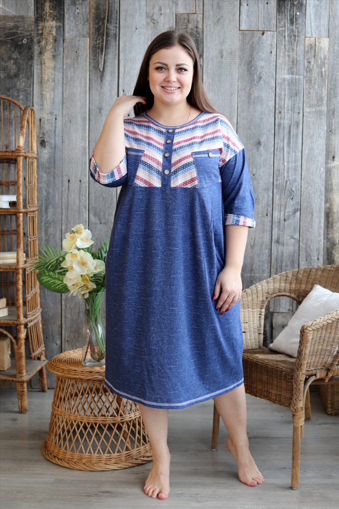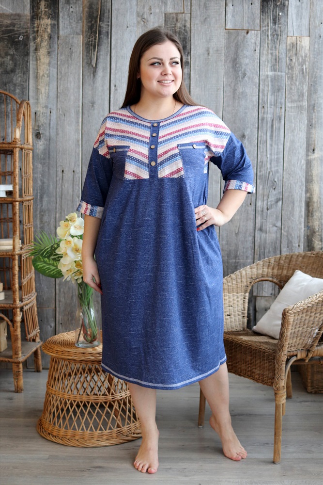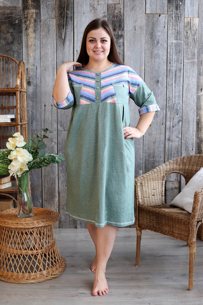 Застежка: без застежки Платье женское прямого силуэта. Рукав цельнокроенный со швом. Верхняя часть полочки и манжета рукава из отделочной ткани в полоску. В верхней части полочки накладные карманы и имитация планки, в нижней: встречные складки, обеспечивающие дополнительную свободу в области талии и бедер. На модели 52 размер