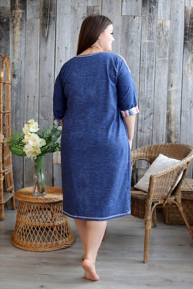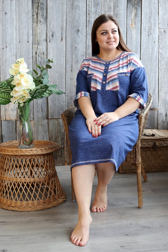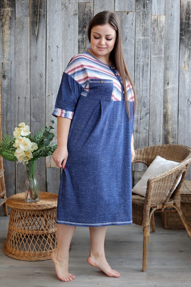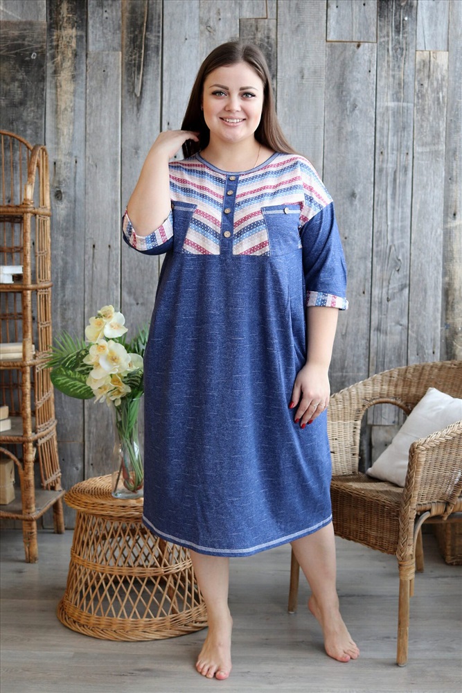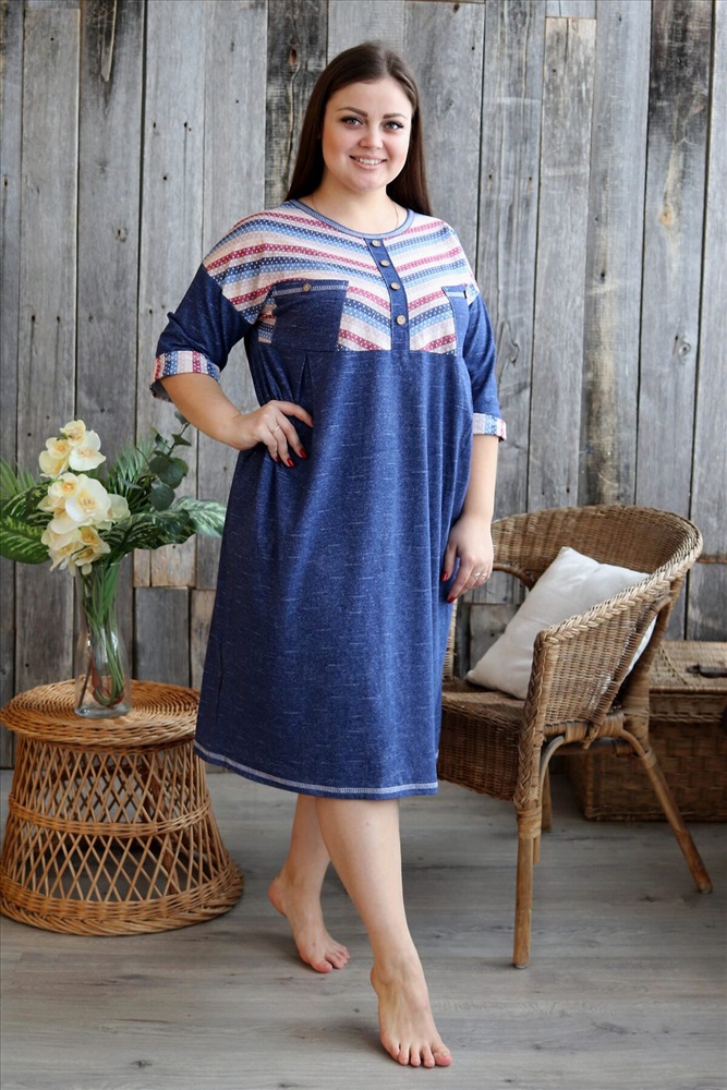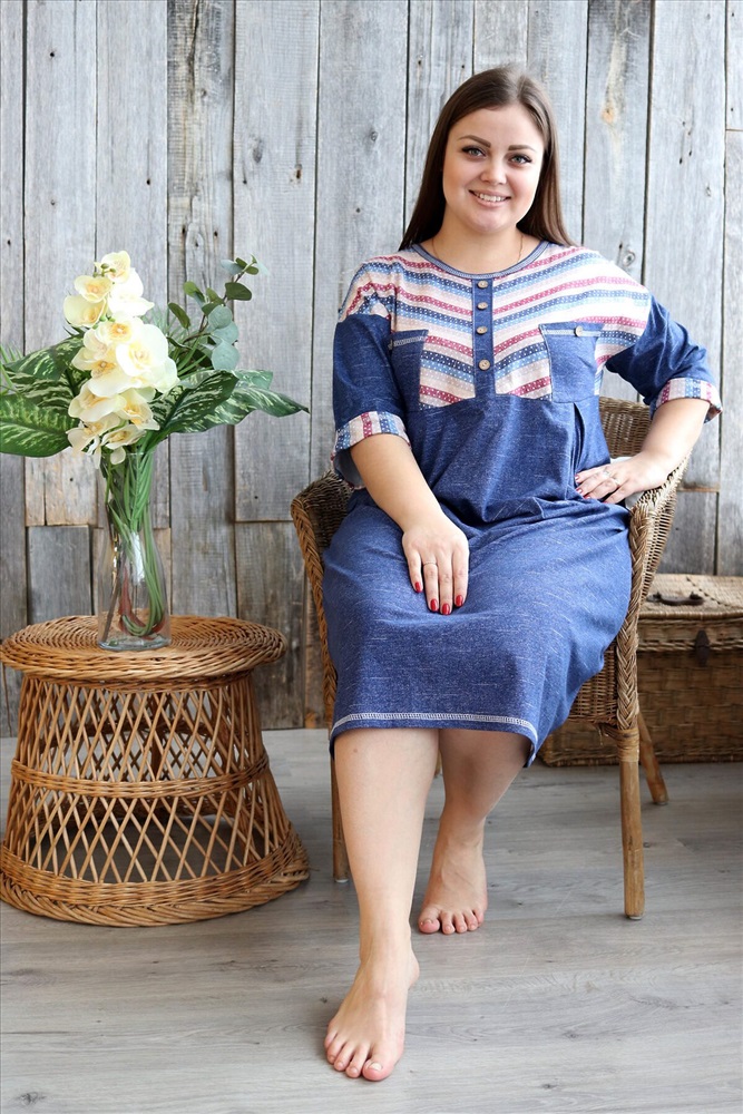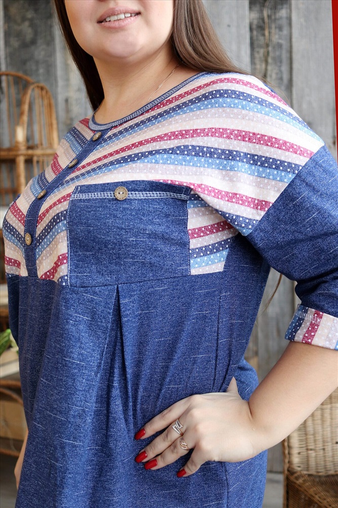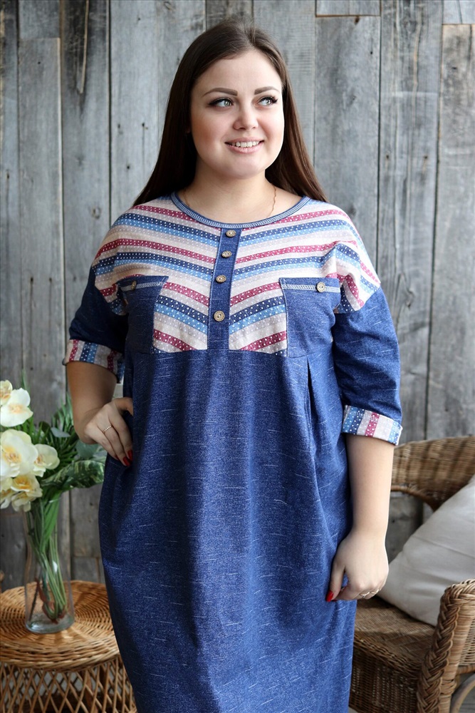 Страна производства: Россия Платье женское прямого силуэта. Рукав цельнокроенный со швом. Верхняя часть полочки и манжета рукава из отделочной ткани в полоску. В верхней части полочки накладные карманы и имитация планки, в нижней: встречные складки, обеспечивающие дополнительную свободу в области талии и бедер. На модели 52 размер