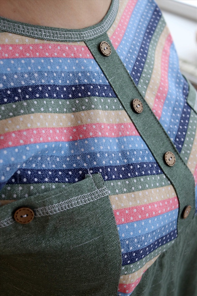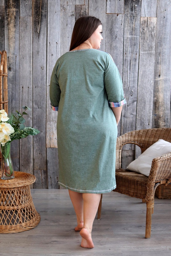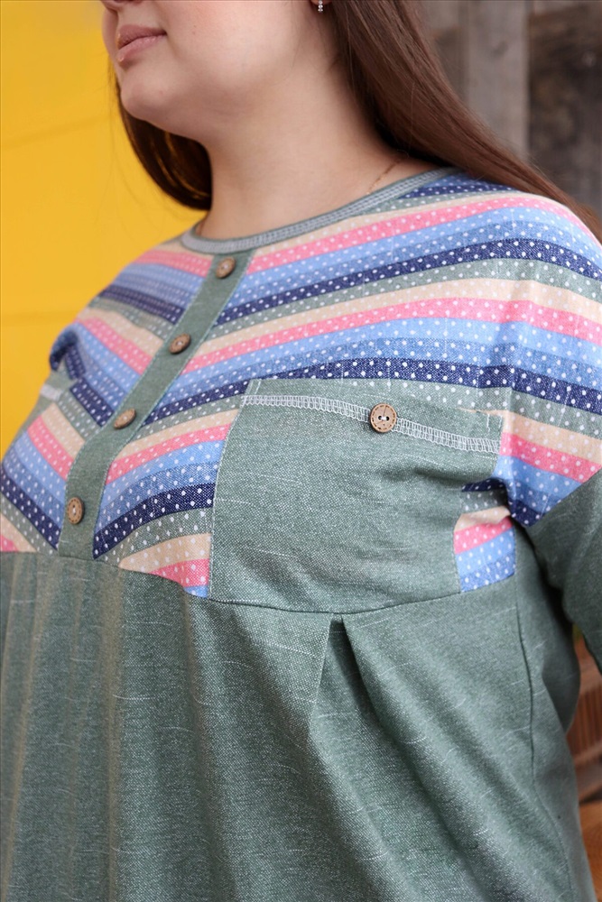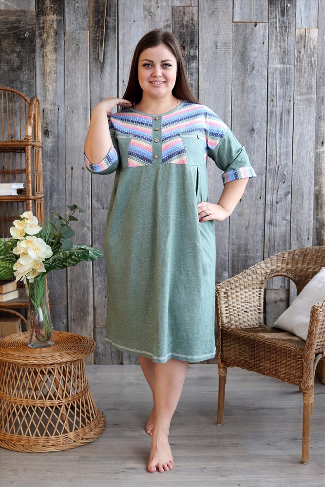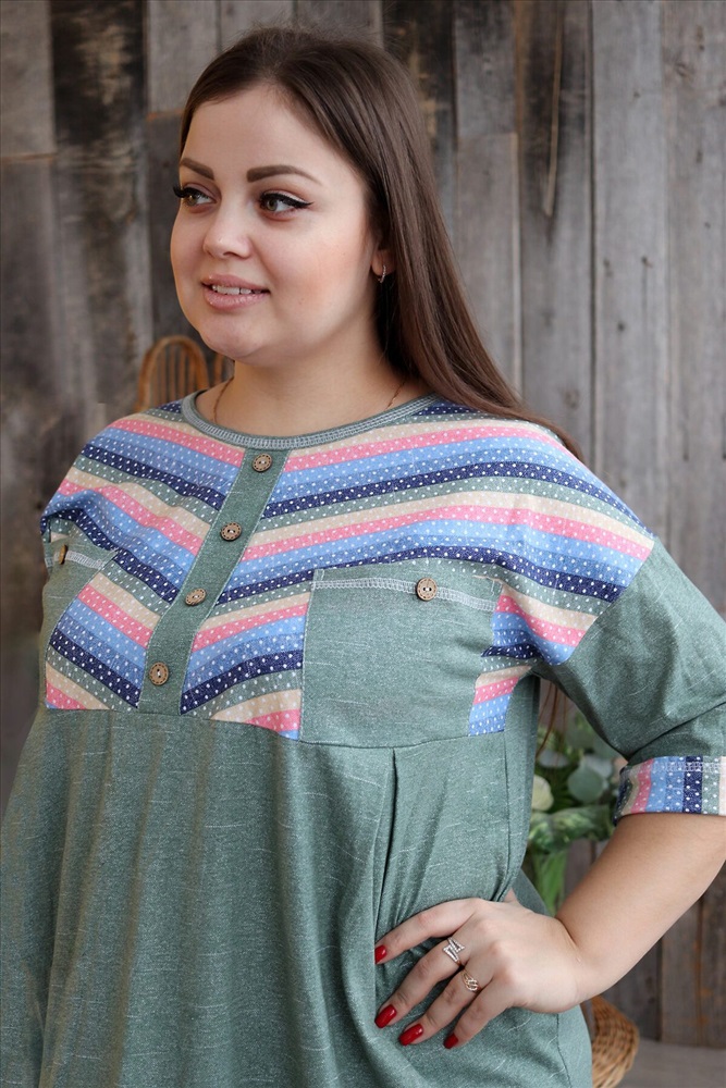 Страна производства: Россия Платье женское прямого силуэта. Рукав цельнокроенный со швом. Верхняя часть полочки и манжета рукава из отделочной ткани в полоску. В верхней части полочки накладные карманы и имитация планки, в нижней: встречные складки, обеспечивающие дополнительную свободу в области талии и бедер. На модели 52 размер