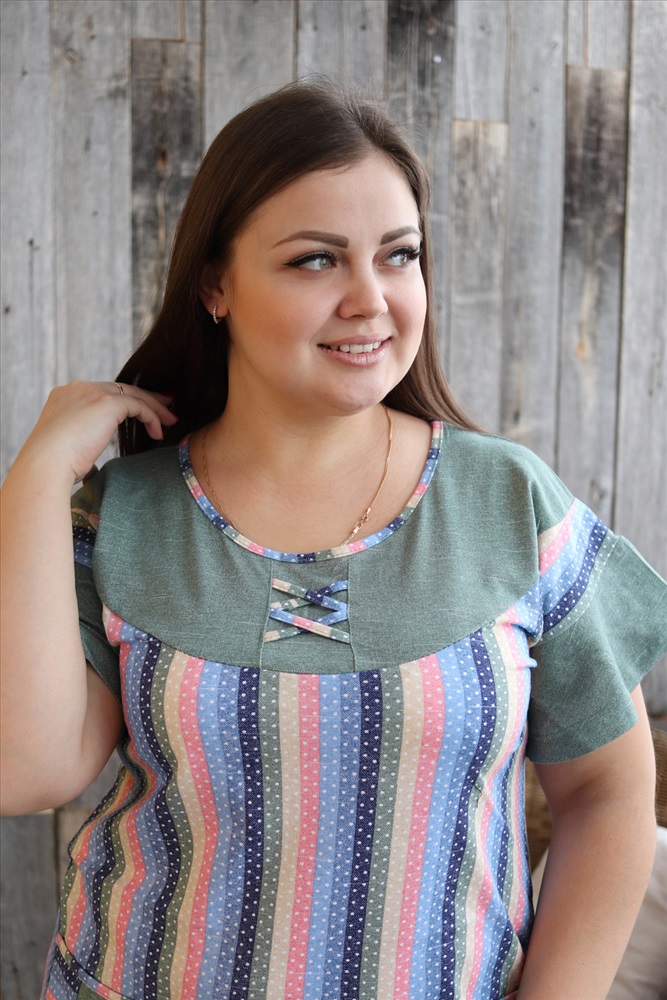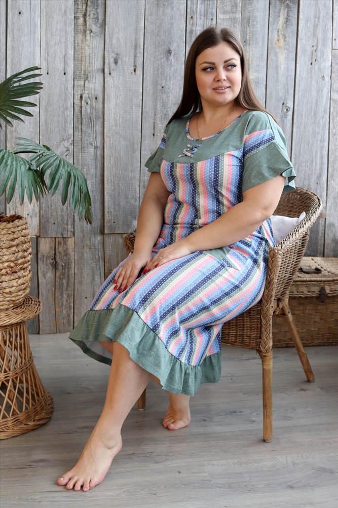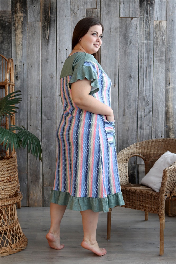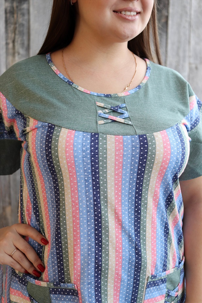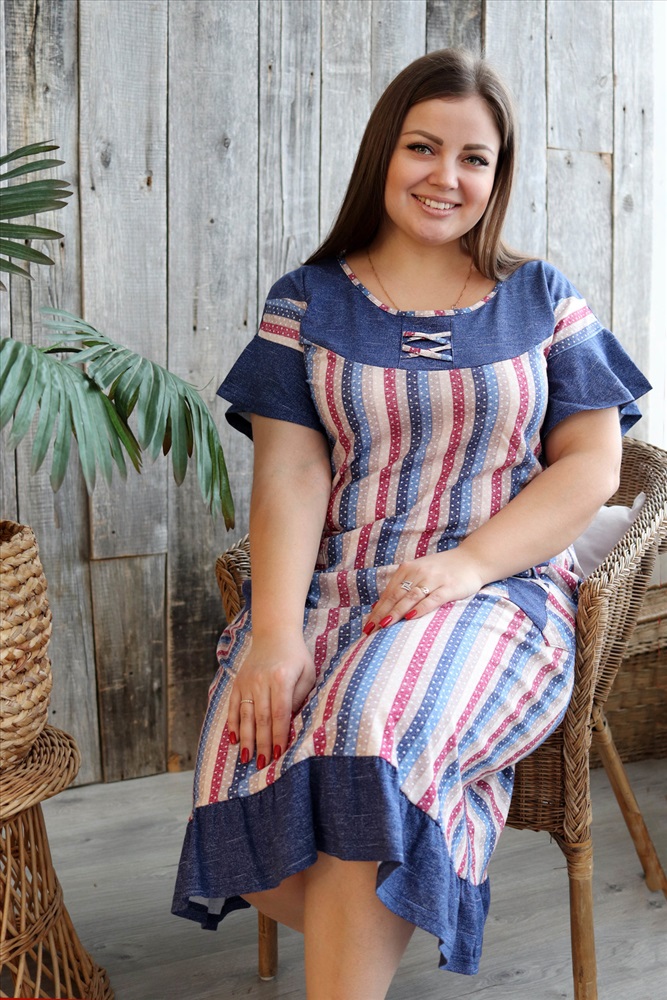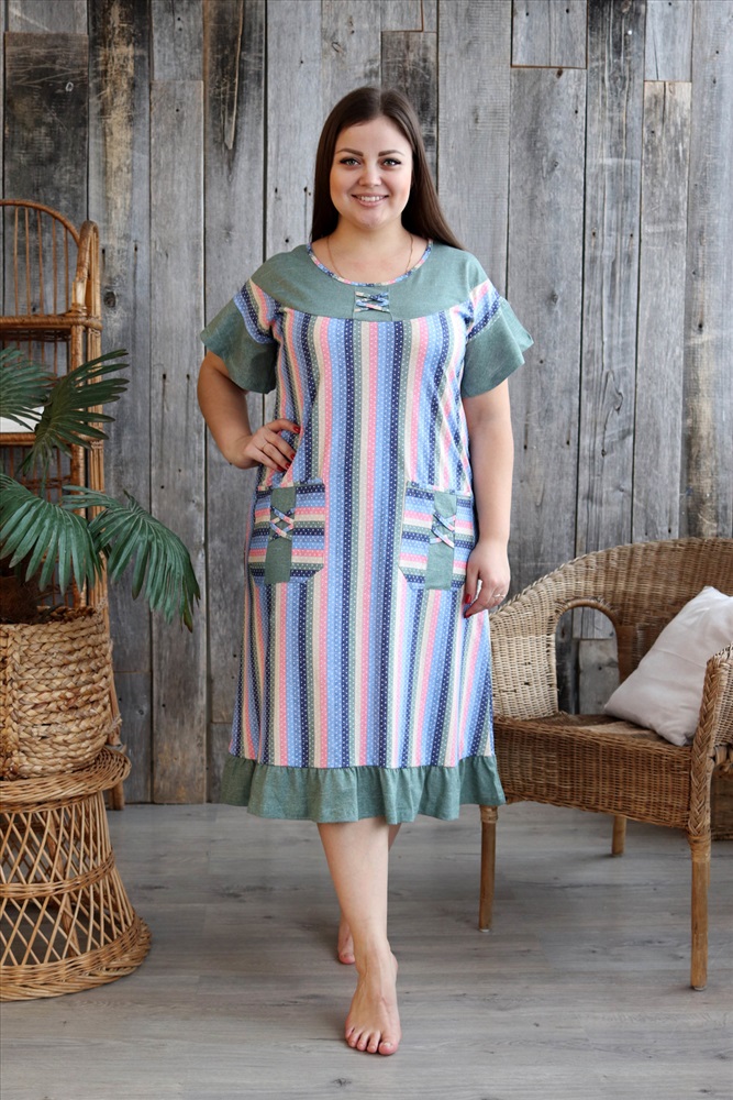 Застежка: без застежки Платье женское полуприлегающего силуэта из ткани в полоску. Рукав короткий цельнокроенный с воланом. На полочке накладные карманы. Кокетка полочки и спинки, воланы рукавов, рюша низа изделия из отделочной ткани. На кокетке полочки и карманах декоративная отделка в виде переплетающейся бейки. На модели 52 размер