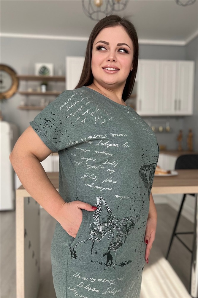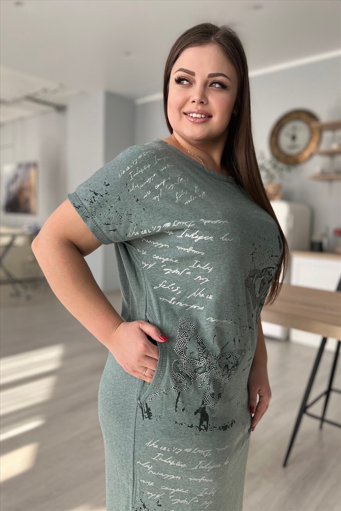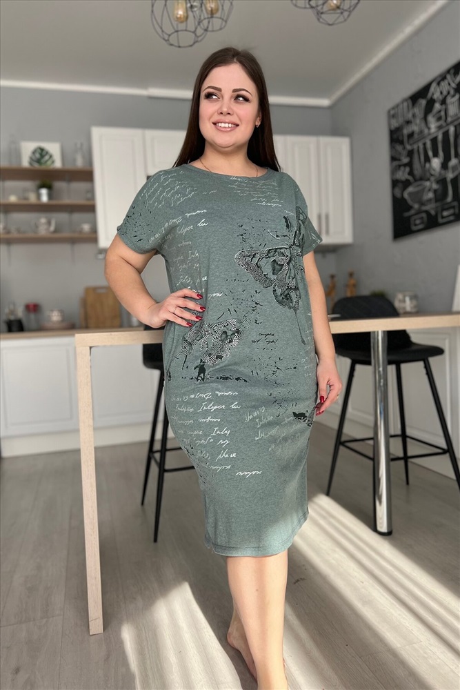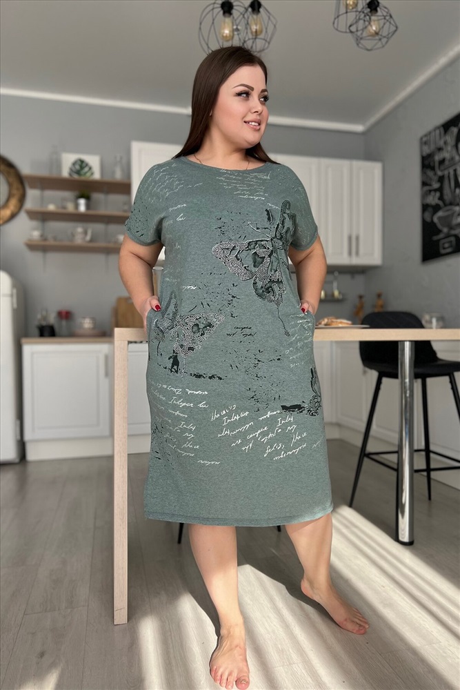 Страна производства: Россия Платье женское прямого силуэта. Рукав цельнокроенный короткий. В боковых швах два внутренних кармана, внизу небольшие разрезы. На полочке красивый принт в виде бабочек