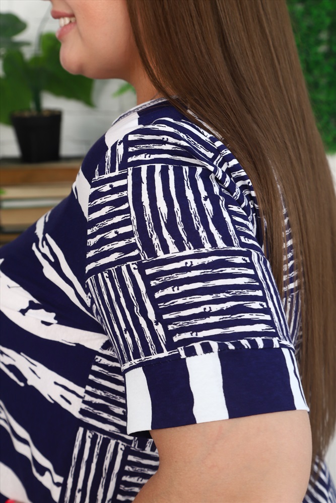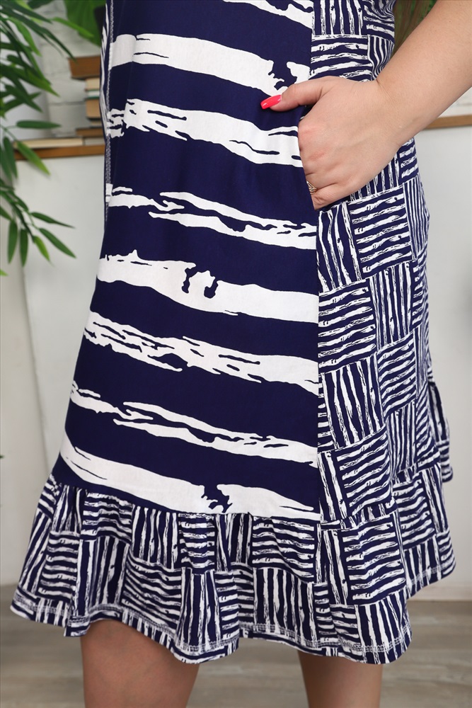 Застежка: без застежки Платье женское, слегка расширенное к низу. Рукав втачной короткий с манжетой. Полочки из двух частей из ткани в полоску, вертикальные полосы на одной части, горизонтальные - на другой. Внутренние карманы в боковых швах. Спинка, рукав и рюша внизу из отделочной ткани в клетку. На моделях 48 и 52 размеры