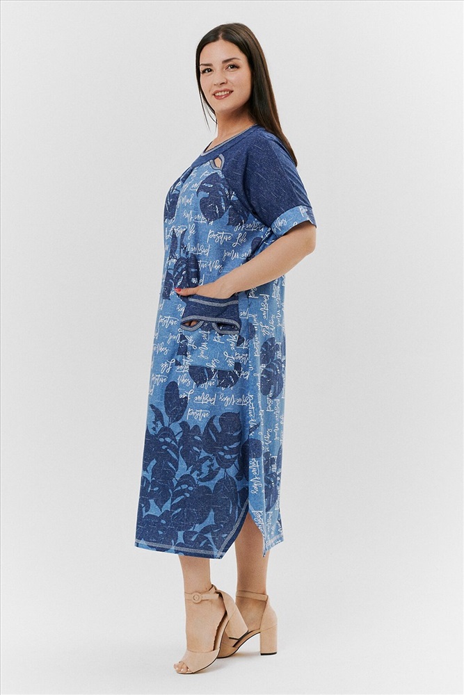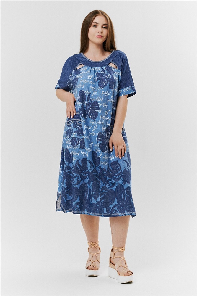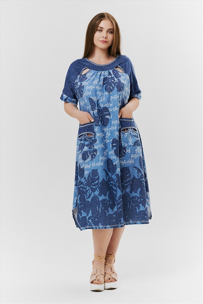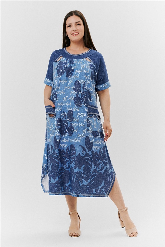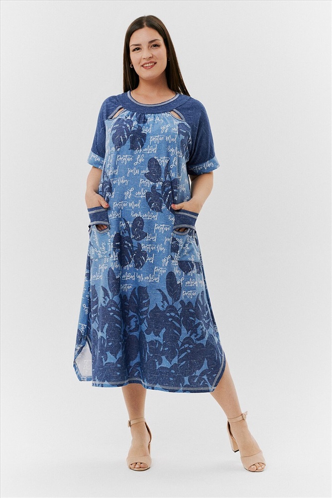 ID товара: 791431 Состав: Хлопок 100% Сезон: Весна/Лето Длина: Ниже колена Фасон: Трапеция Рукав: Короткие Вырез горловины: Округлый Рисунок: растительный Тип карманов: Накладные Декоративные элементы: Разрезы Основная ткань: Хлопок | Кулирка Стиль: Повседневный Страна бренда: Россия Страна производства: Россия Платье женское, расширенное к низу. Рукав реглан, короткий, на манжете. По горловине - обтачки, в шве притачивания рукава к полочке в области обтачки, разрез в форме листка. На полочке накладные карманы, с обтачкой и разрезами. Боковые швы внизу платья срезаны под углом. Комментарии к товару