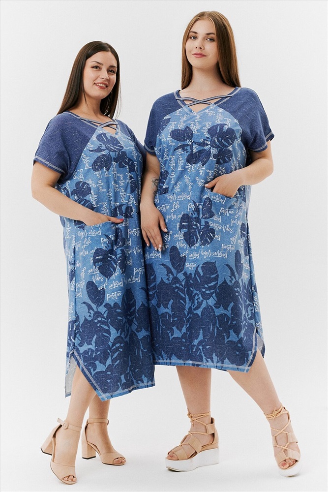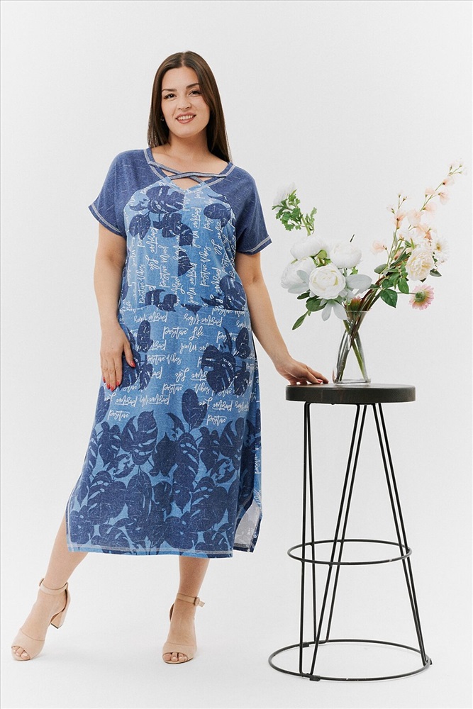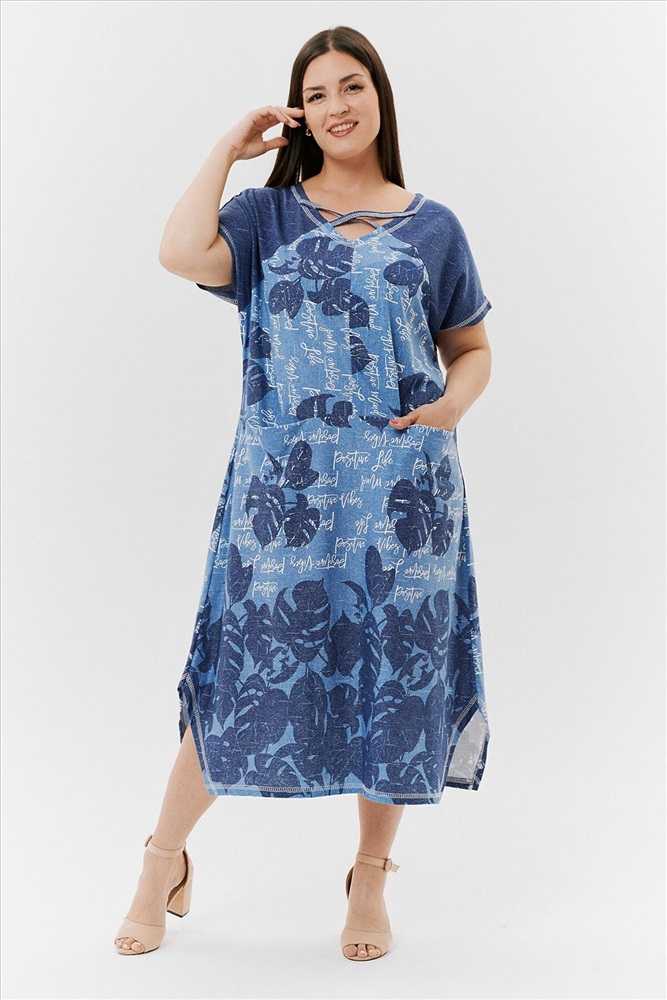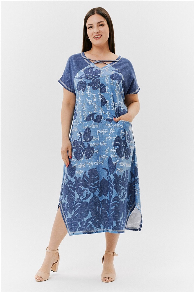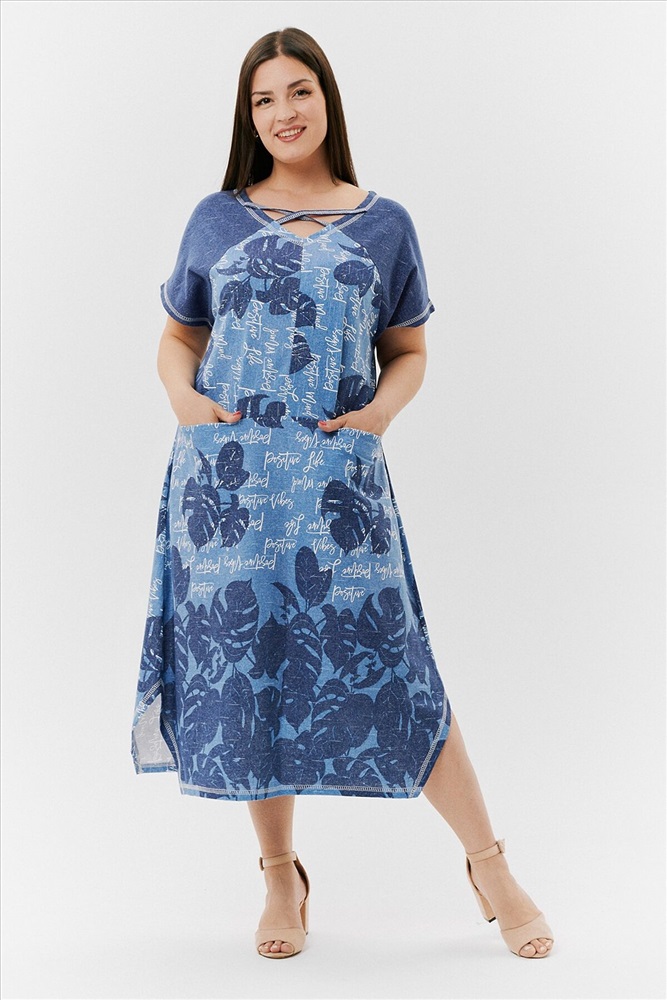 Страна производства: Россия Платье женское, расширенное к низу. Рукав реглан, короткий. На Y-образной горловине два пересекающихся хляста из окантовки. В шве притачивания верхней и нижней частей полочки внутренние горизонтальные карманы. Боковые швы внизу платья срезаны под углом.