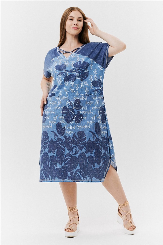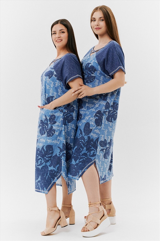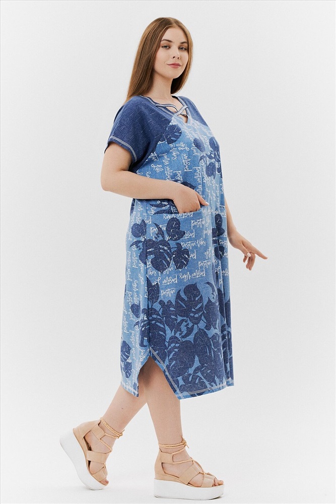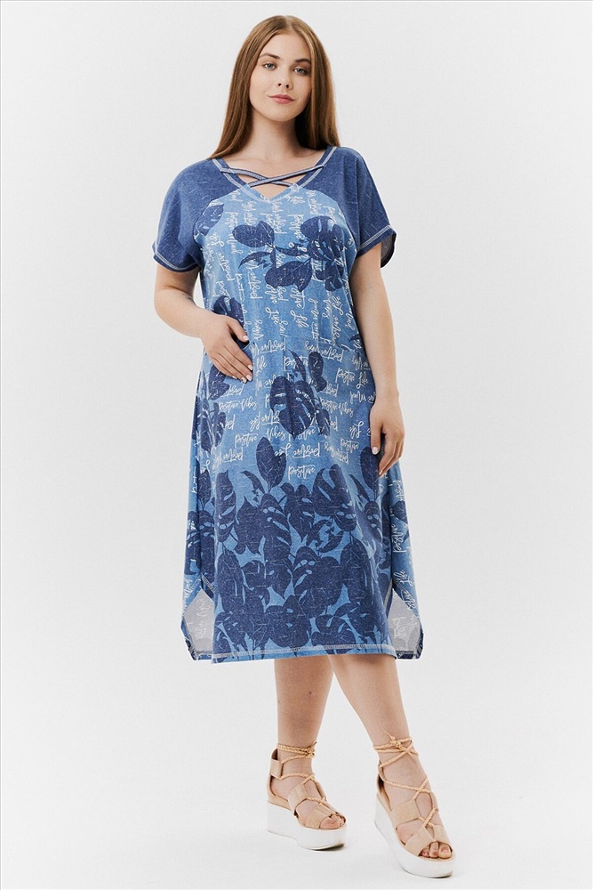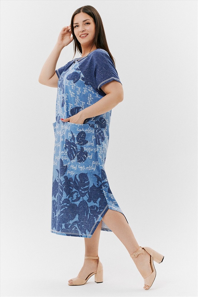 Страна производства: Россия Платье женское, расширенное к низу. Рукав реглан, короткий. На Y-образной горловине два пересекающихся хляста из окантовки. В шве притачивания верхней и нижней частей полочки внутренние горизонтальные карманы. Боковые швы внизу платья срезаны под углом.