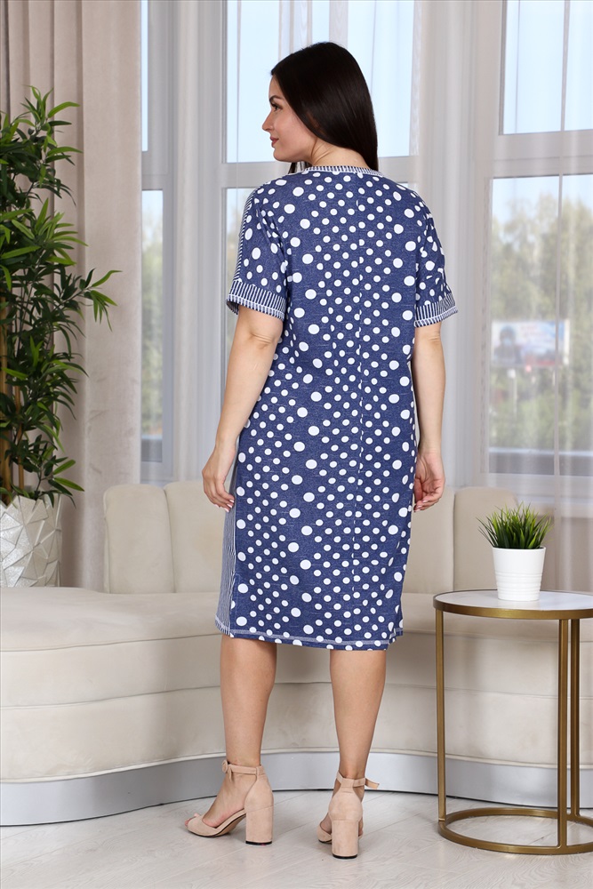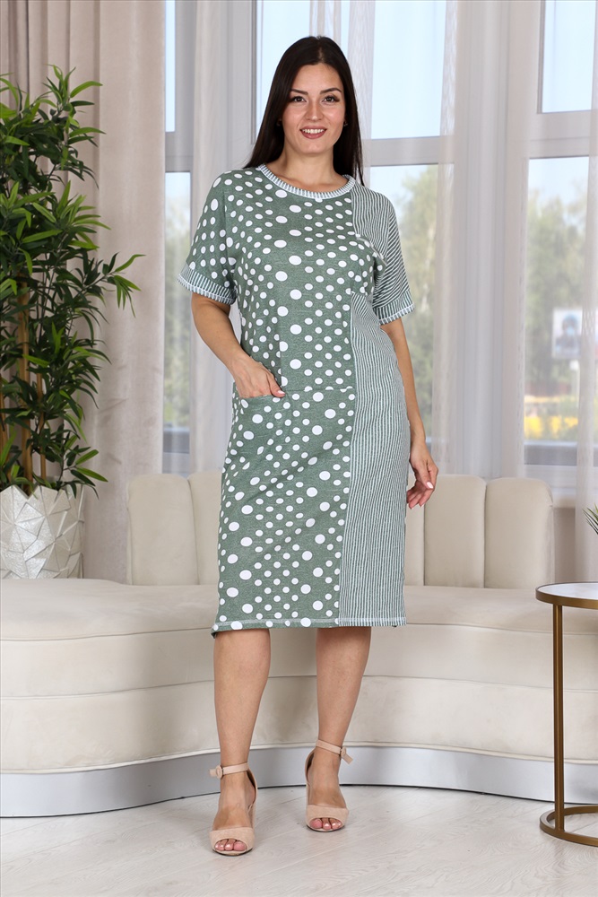 Застежка: без застежки Платье женское полуприлегающего силуэта, рукав цельнокроеный короткий. Полочка состоит из трех частей. Левая боковая часть из полосатой ткани, вверху которой расположен нагрудный карман. С правой стороны полочки в горизонтальном шве внутренний карман. Круглый вырез горловины и манжеты рукава окантованы бейкой из полосатой ткани и белым кантом. Правая часть полочки и спинка из ткани в горошек, что придает платью еще большую актуальность.