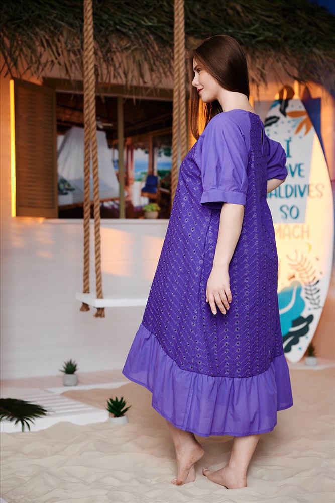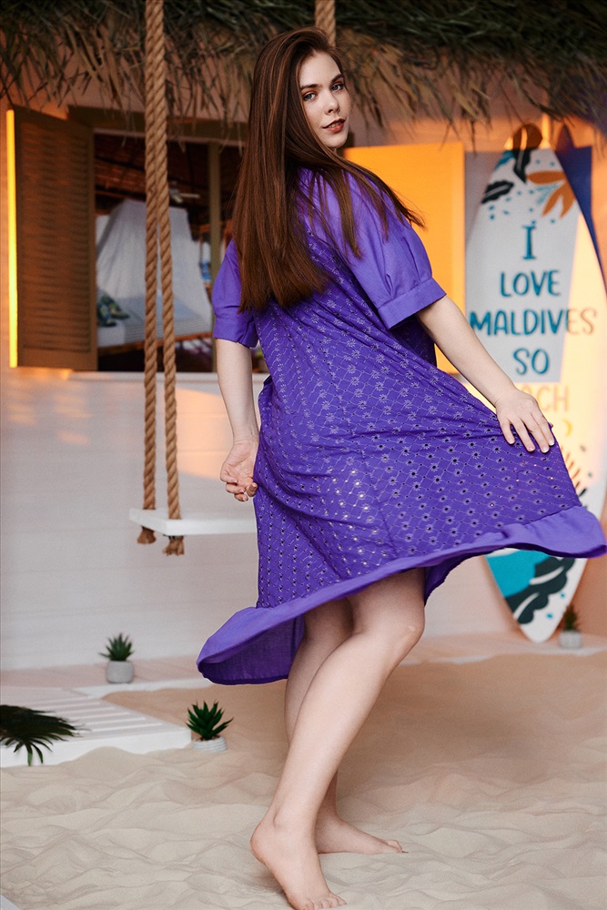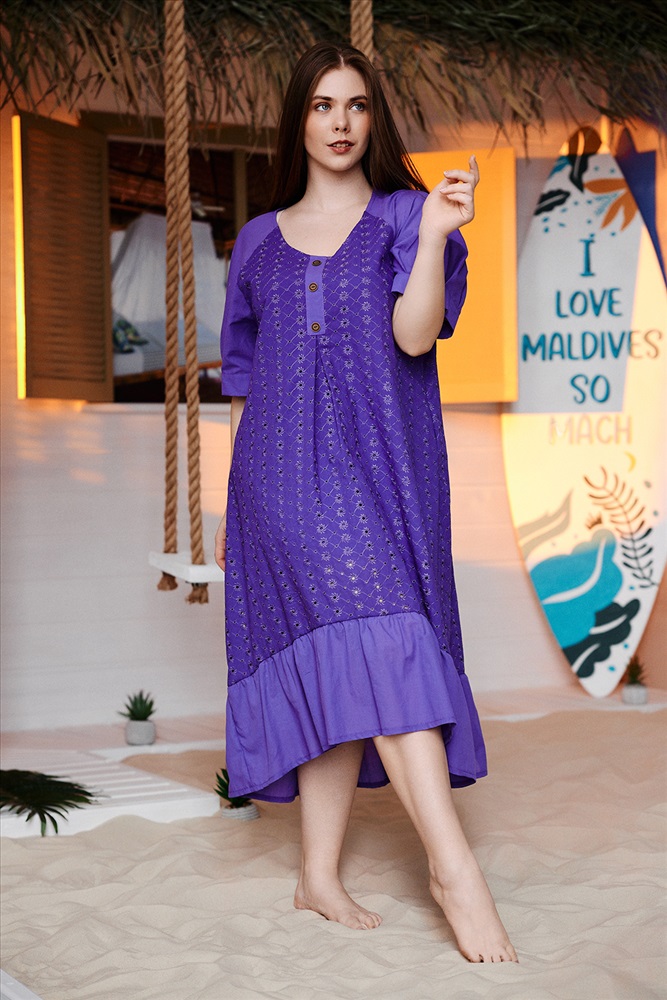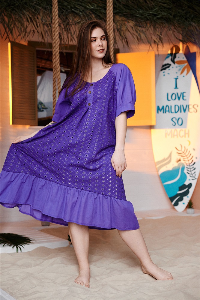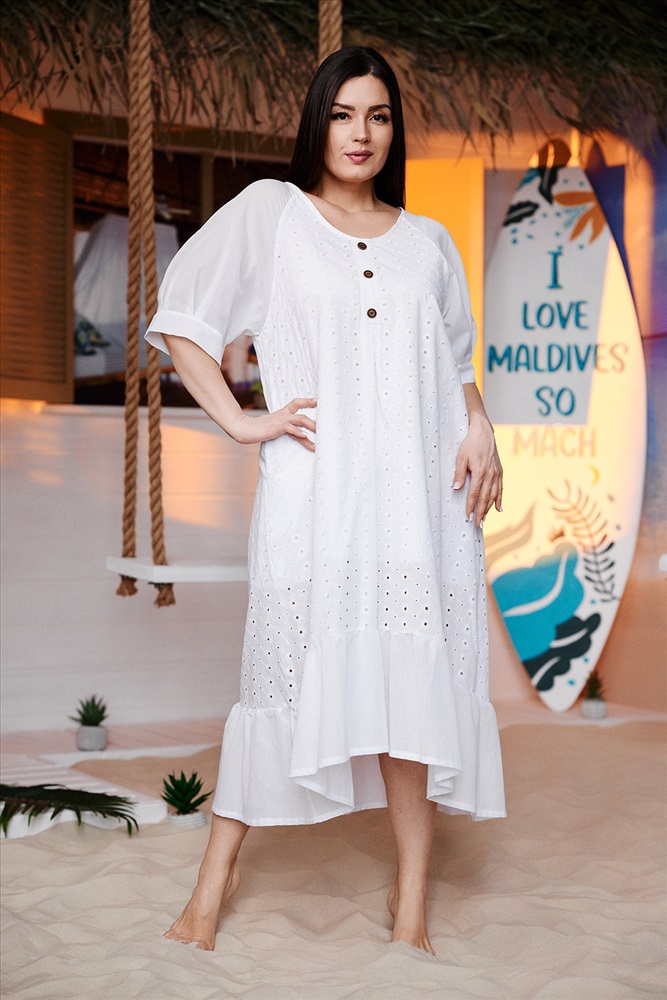 Состав: хлопок 100% Модель: Платье 9183 Тип товара: платье Материал: шитье | шитье Бренд: Натали Суслова Длина: длинный Карман: боковые Назначение: для пляжа Отделка: с карманами | с манжетами | с воланами Рисунок: однотонные Рукав: короткий рукав Сезонность: лето Силуэт: свободный Стиль: пляжный | повседневный Воротник: без воротника Застежка: без застежки Платье женское, расширенное к низу. Горловина округлая, на полочке имитация планки с тремя пуговицами. Рукав реглан с манжетой и тремя складками. Фигурный низ платья заканчивается широкой рюшей. Таблица размеров и веса