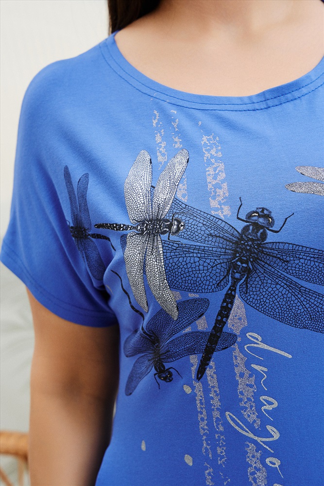 Застежка: без застежки Платье женское полуприлегающего силуэта, слегка расширенное к низу. Рукав цельнокроенный короткий. Горловина округлая. В боковом шве внутренние карманы. На полочке крупный стильный принт.