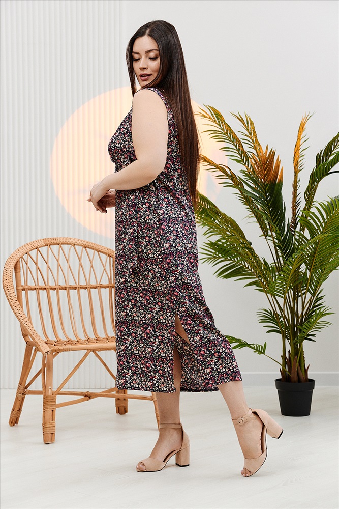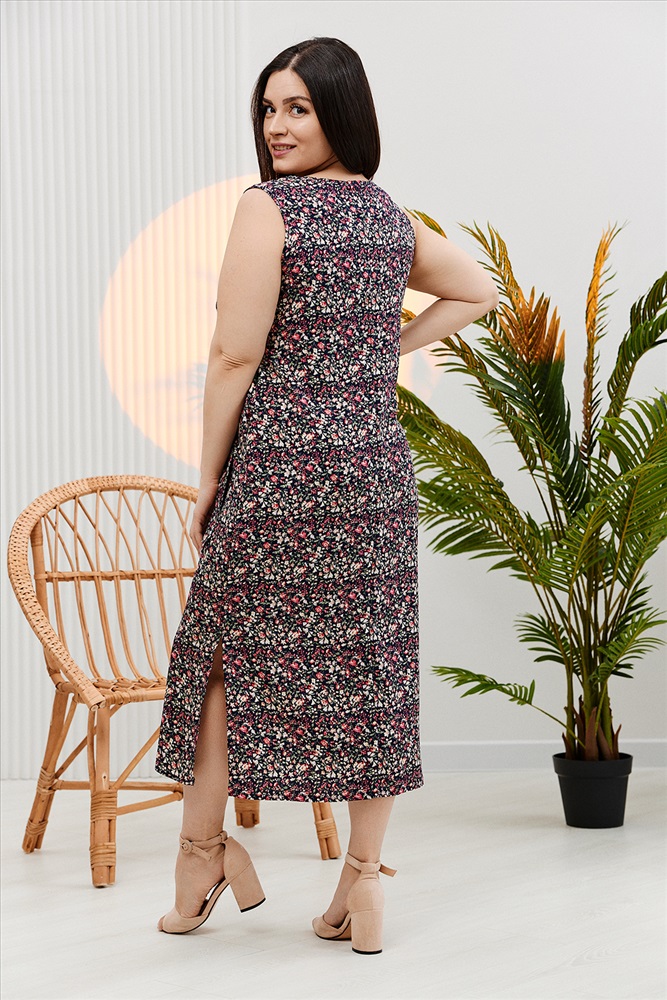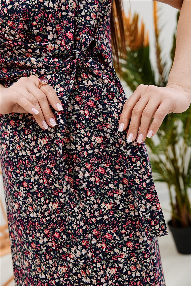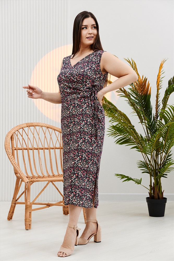 Застежка: на запах | пояс Платье женское полуприлегающего силуэта. Верхняя правая часть полочки со складками запахивается на левую. Прилегание по талии регулируется завязками. От линии бедер платье прямое с боковыми разрезами. В лекалах учтена незначительная усадка ткани после стирки.