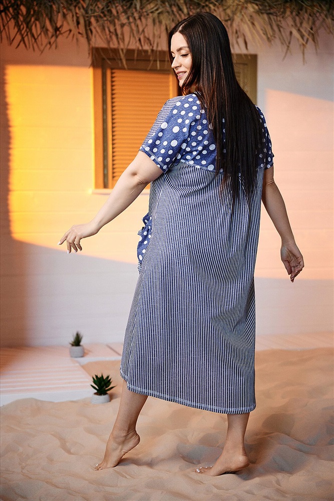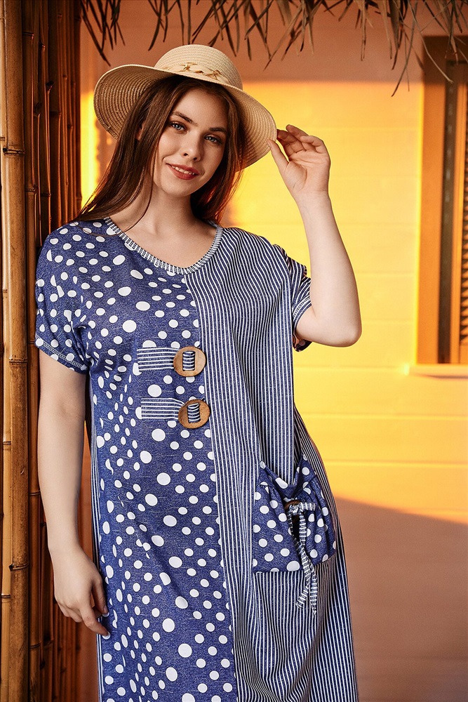 ID товара: 891548 Состав: Хлопок 100% Сезон: Весна/Лето Длина: Миди Фасон: Свободный крой Рукав: короткие Вырез горловины: V-образный Рисунок: Горох Тип карманов: Накладные Декоративные элементы: Пуговицы Основная ткань: Хлопок Стиль: повседневный Вид ткани: Кулирка Страна бренда: Россия Страна производства: Россия Платье женское, свободное, к низу расширенное. Рукав цельнокроенный короткий. Горловина Y-образная. Платье из двух полочек , одна полочка и кокетка спинки: в горошек, другая полочка и спинка: в полоску. На полочке в полоску большой накладной карман из ткани в горошек с декоративной кокосовой пуговицей на завязке. На полочке в горошек чуть ниже линии груди настрочены два хляста с декоративными кокосовыми пуговицами. На спинке сзади складка для обеспечения достаточной свободы по бедрам. Низ платья фигурный, полочка короче спинки. Комментарии к товару