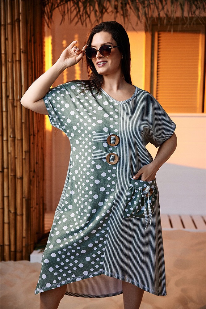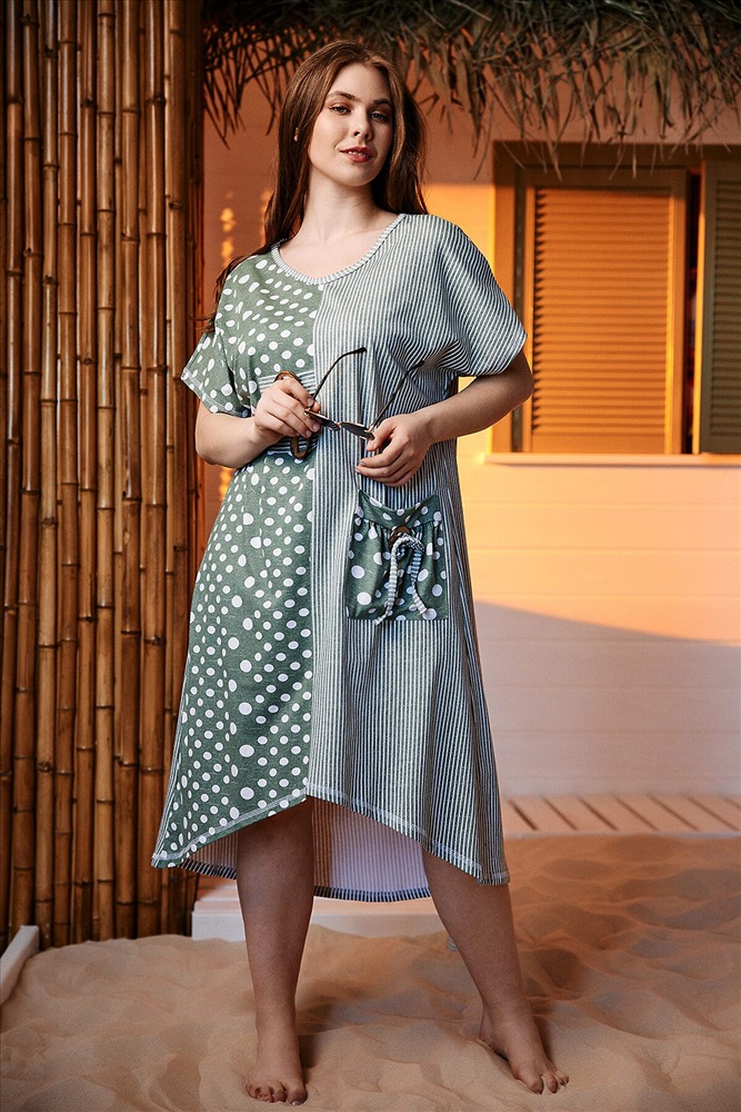 Производитель: НАТАЛИ ID товара: 891549 Состав: Хлопок 100% Сезон: Весна/Лето Длина: Миди Фасон: Свободный крой Рукав: короткие Вырез горловины: V-образный Рисунок: Горох Тип карманов: Накладные Декоративные элементы: Пуговицы Основная ткань: Хлопок Стиль: повседневный Вид ткани: Кулирка Страна бренда: Россия Страна производства: Россия