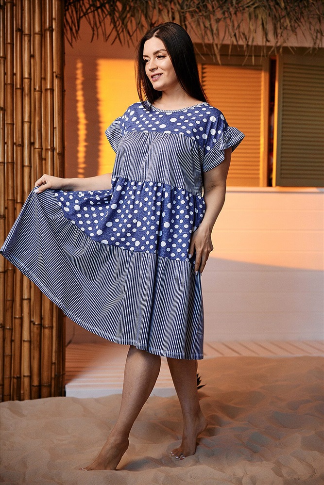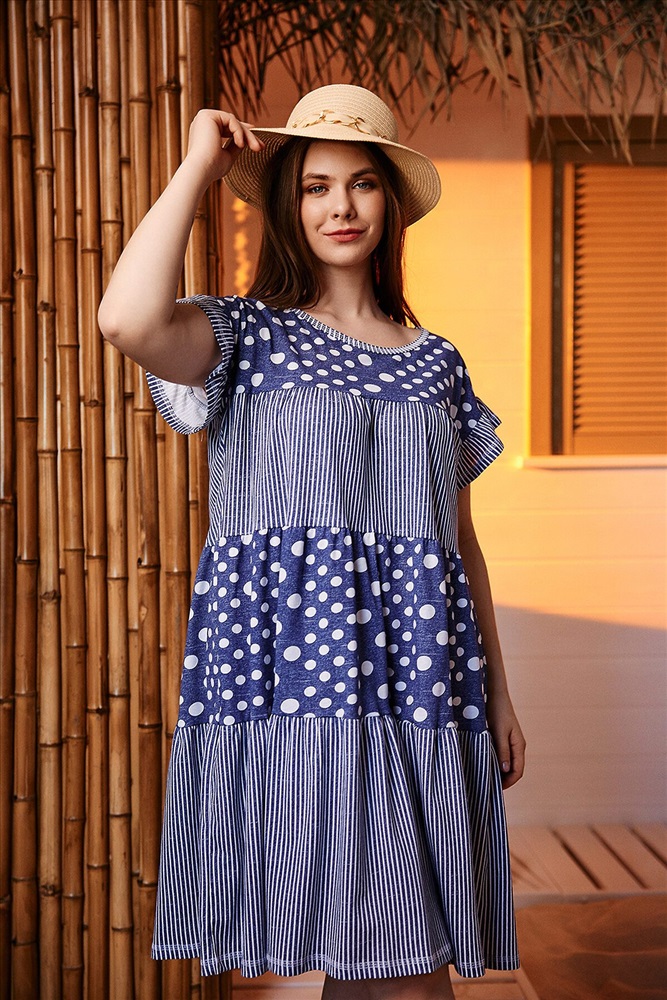 ID товара: 891556 Состав: Хлопок 100% Сезон: Весна/Лето Длина: Ниже колена Фасон: Свободный крой Рукав: короткие Вырез горловины: Округлый Рисунок: Полоски Тип карманов: В шве Декоративные элементы: Принт Основная ткань: Хлопок Стиль: повседневный Вид ткани: Кулирка Страна бренда: Россия Страна производства: Россия Платье женское, свободное, к низу расширенное за счет сборки каждого из трех ярусов. Рукав цельнокроеный короткий, внизу рукава рюша. Вырез горловины округлый. Эта модель платья очень комфортна для любого типа женской фигуры, а сочетание ткани в горошек и полоску придает изделию особую привлекательность. Комментарии к товару
