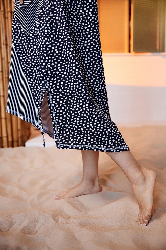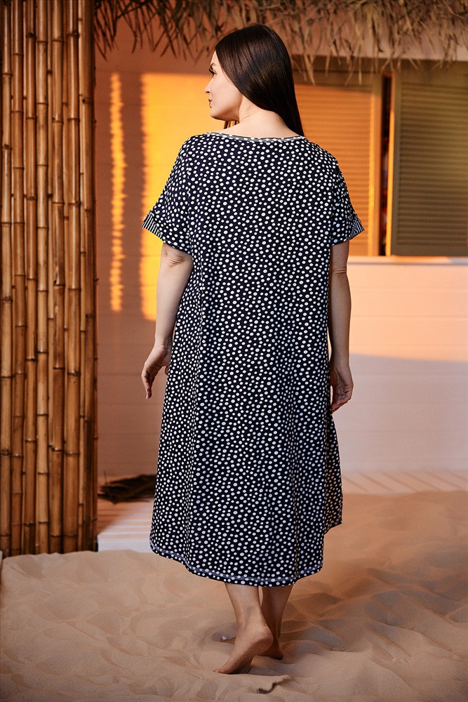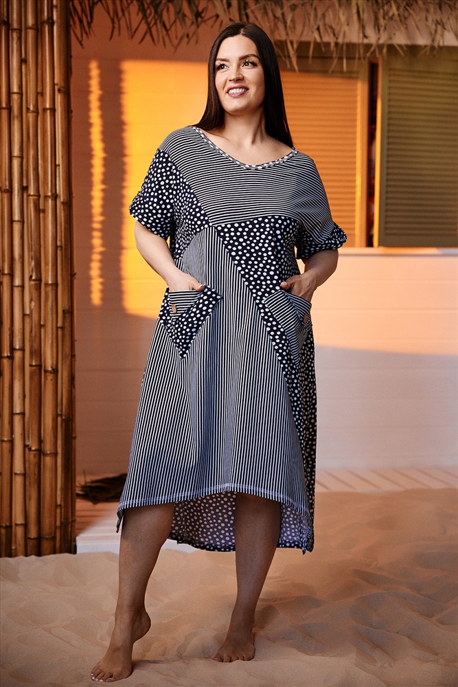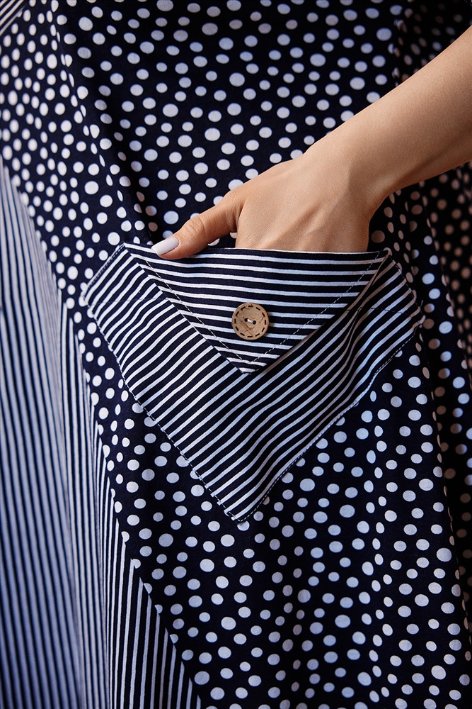 Застежка: без застежки Платье женское, свободное, силуэт трапеция. Рукав короткий цельнокроенный с манжетой. Горловина Y-образная. Полочка состоит из четырех асимметричных частей, две части по диагонали из ткани в горошек, две другие - из мелкой полоски. Низ фигурный, спереди короче, чем сзади. По боковым швам разрезы. На полочках два накладных кармана, форма карманов квадраты, расположенные по диагонали, верхние уголки карманов зафиксированы декоративными пуговицами кокос. Также пуговицы пришиты на отогнутых уголках манжет. Сочетание тканей горошка и мелкой полосы придают платью особую неповторимость и привлекательность.