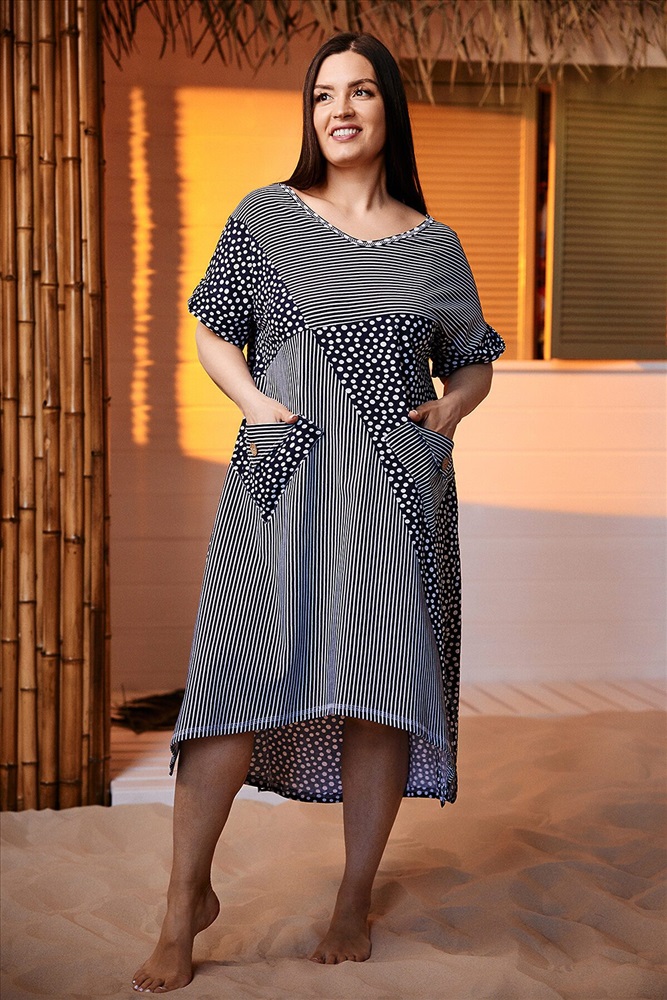 Страна производства: Россия Платье женское, свободное, силуэт трапеция. Рукав короткий цельнокроенный с манжетой. Горловина Y-образная. Полочка состоит из четырех асимметричных частей, две части по диагонали из ткани в горошек, две другие - из мелкой полоски. Низ фигурный, спереди короче, чем сзади. По боковым швам разрезы. На полочках два накладных кармана, форма карманов квадраты, расположенные по диагонали, верхние уголки карманов зафиксированы декоративными пуговицами кокос. Также пуговицы пришиты на отогнутых уголках манжет. Сочетание тканей горошка и мелкой полосы придают платью особую неповторимость и привлекательность.
