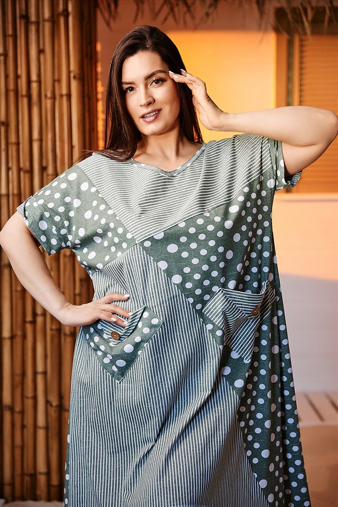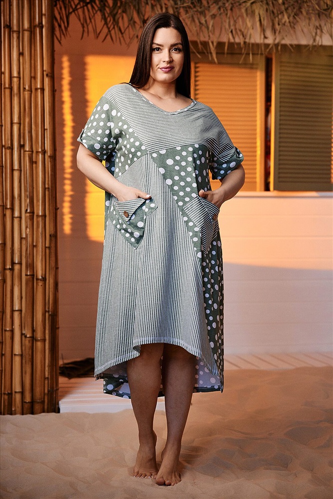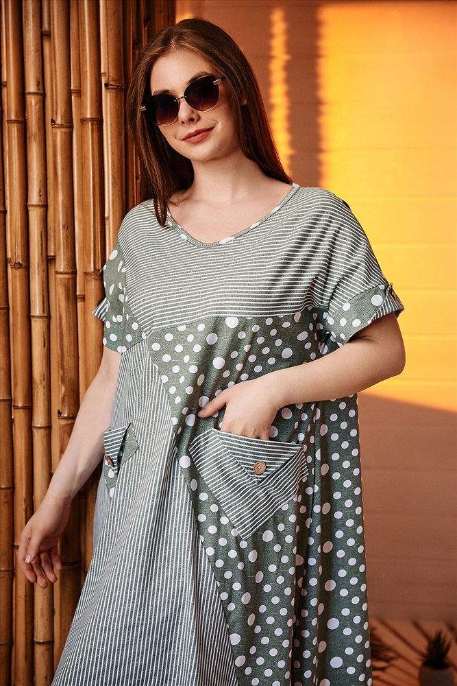 Страна производства: Россия Платье женское, свободное, силуэт трапеция. Рукав короткий цельнокроенный с манжетой. Горловина Y-образная. Полочка состоит из четырех асимметричных частей, две части по диагонали из ткани в горошек, две другие - из мелкой полоски. Низ фигурный, спереди короче, чем сзади. По боковым швам разрезы. На полочках два накладных кармана, форма карманов квадраты, расположенные по диагонали, верхние уголки карманов зафиксированы декоративными пуговицами кокос. Также пуговицы пришиты на отогнутых уголках манжет. Сочетание тканей горошка и мелкой полосы придают платью особую неповторимость и привлекательность.
