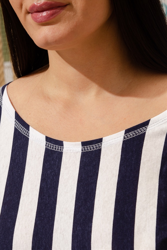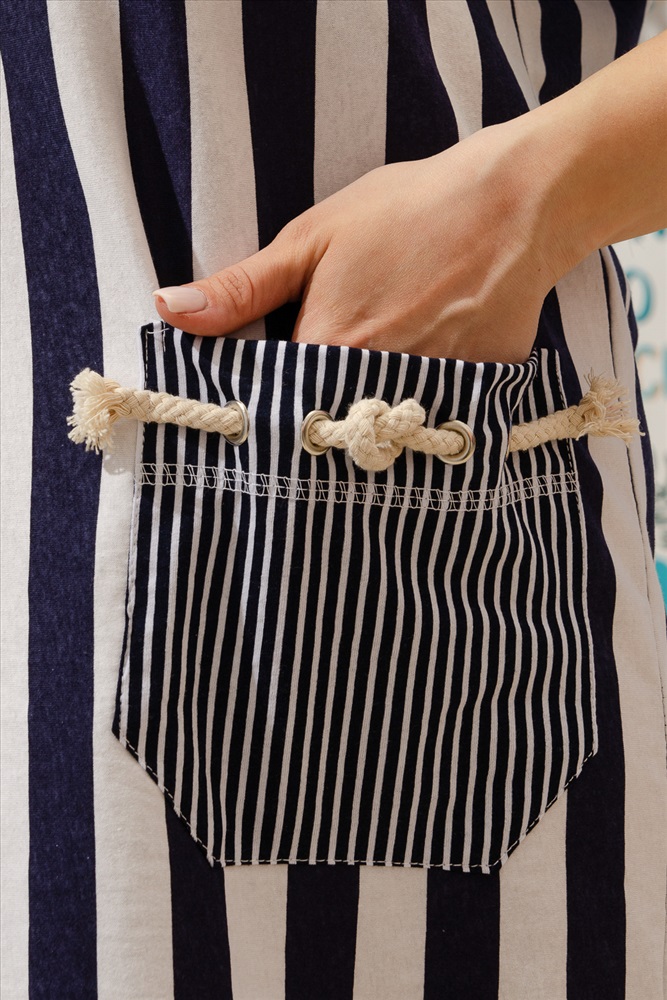 Застежка: без застежки Платье женское прямого силуэта, рукав цельнокроеный короткий с манжетой. Горловина округлая, в боковых швах разрезы. Полочка и спинка из ткани в крупную вертикальную полоску, накладные карманы и манжеты из отделочной ткани в мелкую полоску, это удачное сочетание крупной и мелкой полосы делает платье очень оригинальным. В дополнение актуальной в этом сезоне морской темы служит декоративная тесьма в виде канатов на карманах и в манжетах рукава, канаты продеты в люверсы.