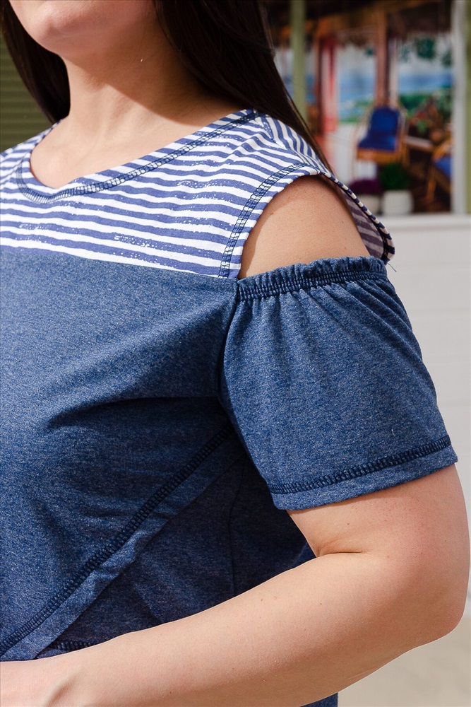 ID товара: 980259 Состав: Хлопок 100%; Хлопок 70%, Полиэстер 30% Сезон: Весна/Лето Фасон: Прямой Рукав: Короткий Вырез горловины: Круглый Рисунок: Полоска Вид ткани: Кулирка Страна бренда: Россия Страна производства: Россия Платье прямого силуэта, слегка расширенное к низу. В модели хорошо сочетаются ткани в полоску и меланжевая. Верхняя часть рукава отсутствует, верхний срез собран благодаря эластичной тесьме. На полочке и спинке кокетки, полочка состоит из трех частей, верхняя часть отлетная. Отдельно изготовленный карман настрочен на полочку. Комментарии к товару