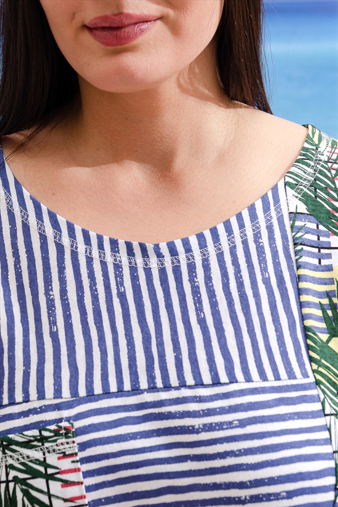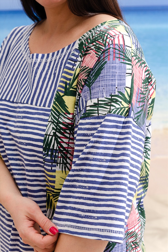 Состав: хлопок 100% Модель: Платье 9233 Тип товара: платье Материал: кулирка | кулирка Бренд: Натали Суслова Длина: средняя длина Карман: накладные Назначение: для дома | для пляжа НДС: 22% Отделка: с карманами Рисунок: полоска | цветы Рукав: рукав 3/4 Сезонность: лето Силуэт: свободный Стиль: домашний | пляжный | повседневный Воротник: без воротника Застежка: без застежки Платье женское прямого силуэта. Рукав цельнокроенный со швом, ниже локтя. Горловина округлая. Полочка и спинка состоят из двух ассиметричных частей из тканей-компаньонов:полоса и пальмы. На правой полочке кокетка и нагрудный карман. Низ фиксируется боковыми утяжками, продетыми в люверсы. Таблица размеров и веса
