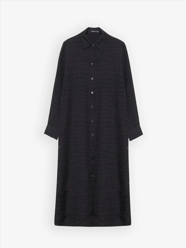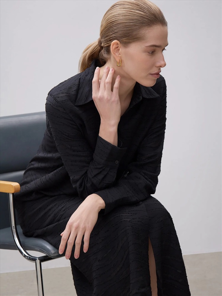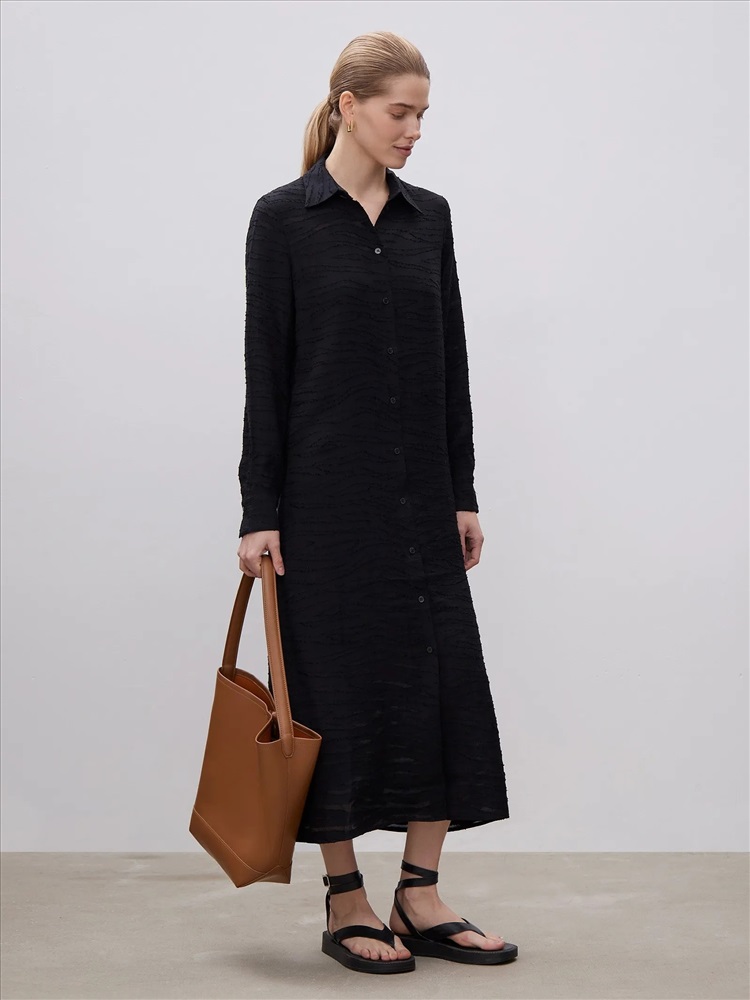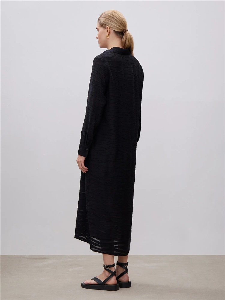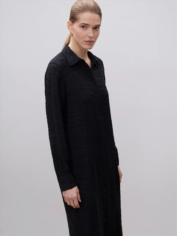 Оригинальное чёрное платье-рубашка с необычной фактурой из вискозы. Модель А-силуэта имеет модную длину миди. Выполнено на комфортной к телу подкладке. Платье станет органичной частью повседневного летнего и демисезонного гардероба.