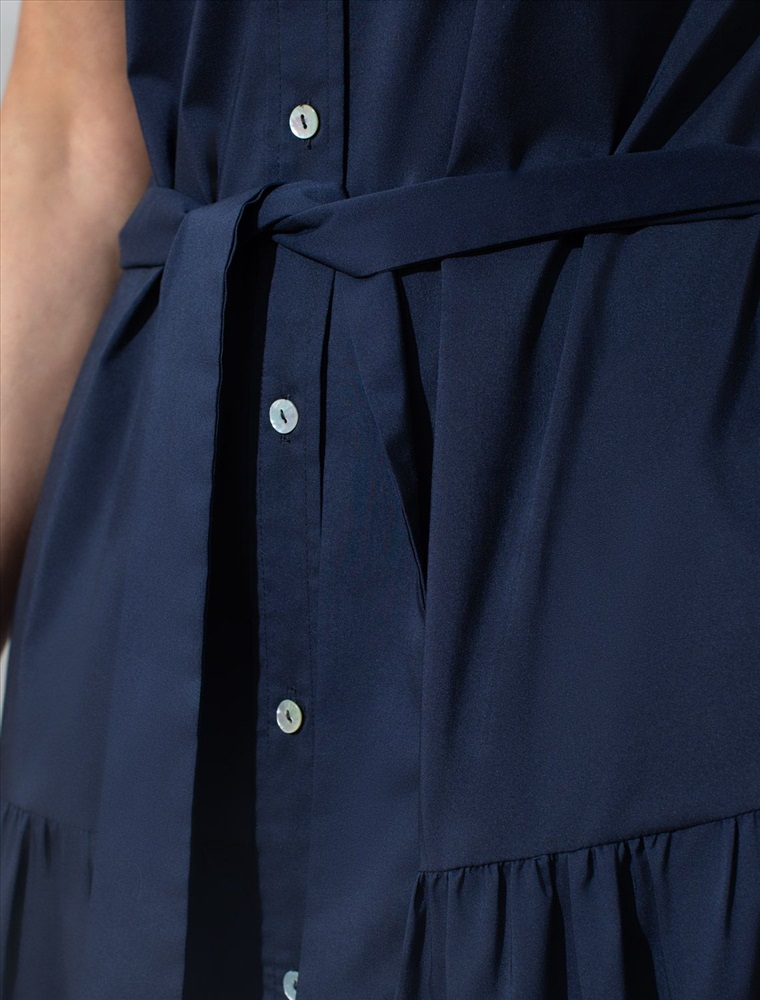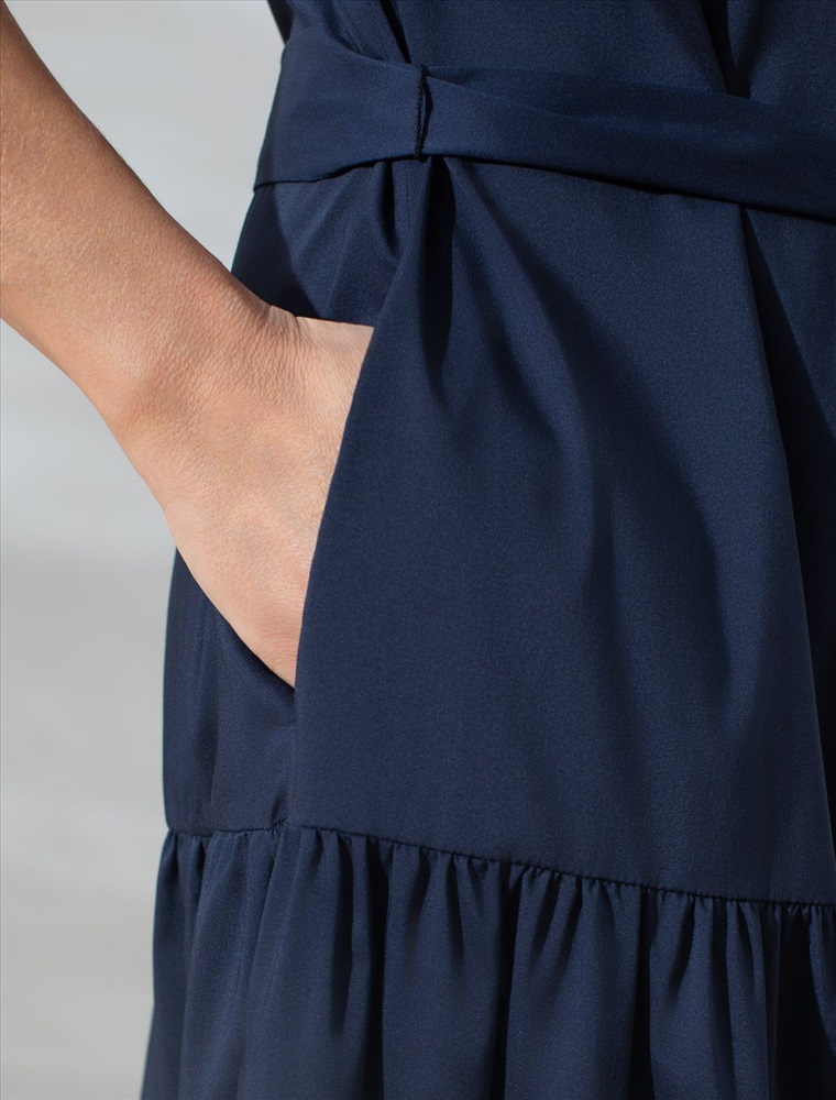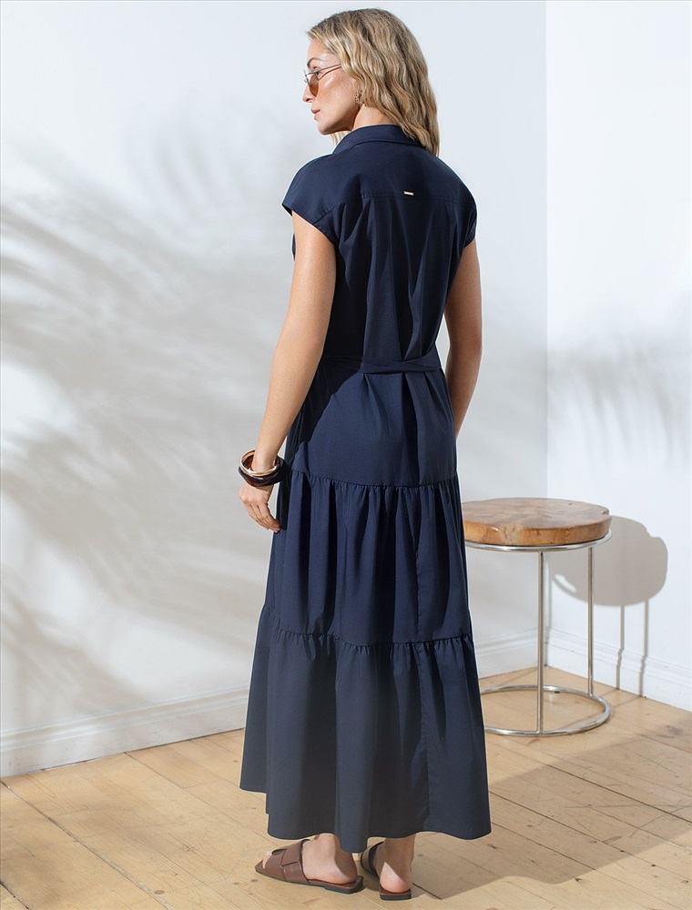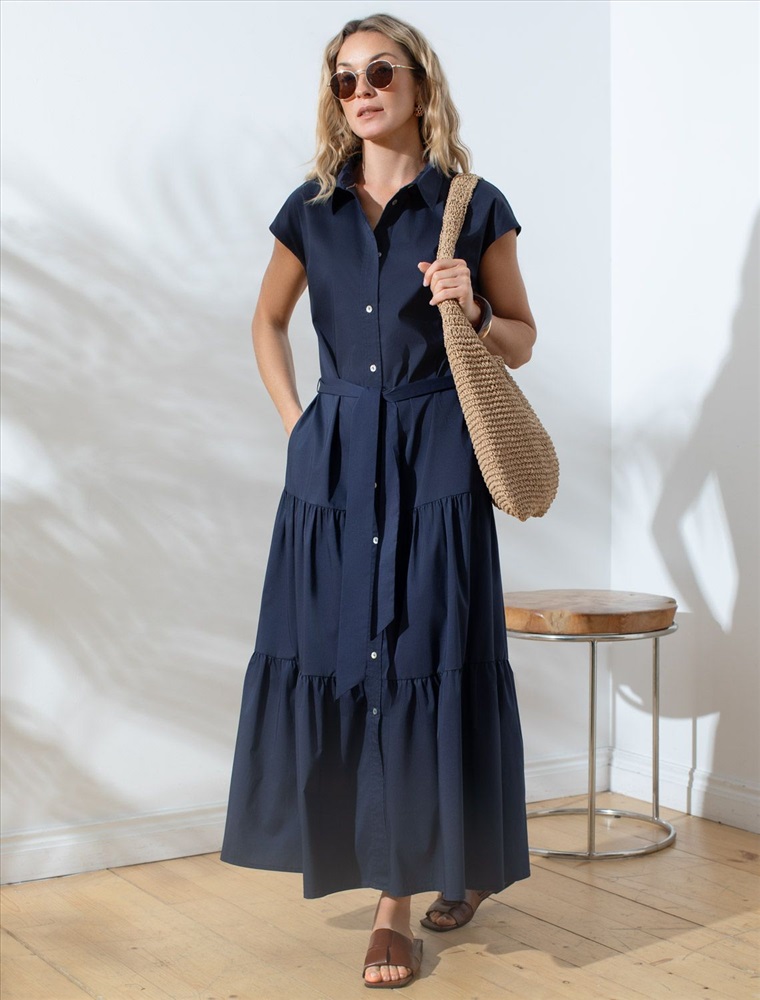 Платье А-силуэта с поясом темно-синего цвета выполнено из легкого хлопкового поплина плотностью 96 Г/м2. Воздушное платье на пуговицах по всей длине с пышной юбкой-воланами в стиле бохо отличный вариант для теплой и жаркой погоды. Модель обладает красивым ярусным кроем, который придает образу женственность и элегантность. Отложной воротничок и короткий рукав создают стильный акцент, подходящий для повседневного ношения и различных ситуаций. Талия подчеркнута поясом, который легко регулируется и подчеркивает силуэт, придавая особый шарм и аккуратность образу. Натуральный состав ткани обладает высокой воздухопроницаемостью, а также способностью поглощать и отдавать влагу. В повседневном платье будет очень комфортно, благодаря правильной регуляции температуры тела. Такая модель подходит на маленький и высокий рост, а так же на любую фигуру, позволяя подчеркнуть достоинства и скрыть возможные недостатки. Это длинное платье отлично подойдет тем, кто ценит удобство и утонченность в одежде из качественной вискозы и хлопка. Красивое легкое платье прекрасно подходит для динамичного рабочего дня, городских прогулок или торжественных мероприятий, его легко адаптировать под разные ситуации и стили.