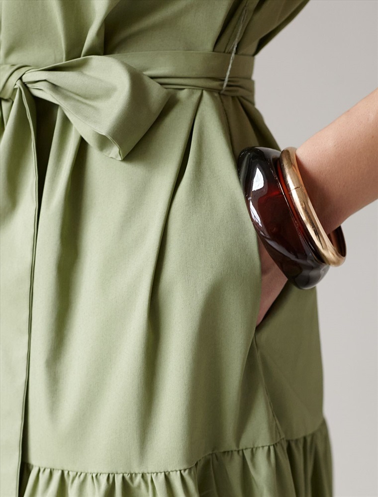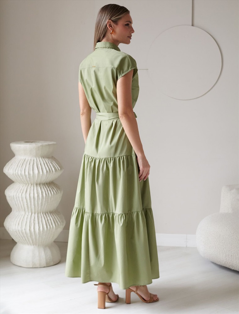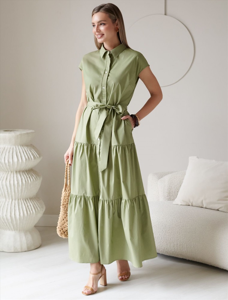 Платье А-силуэта с поясом оливкового цвета выполнено из легкого хлопкового поплина плотностью 96 Г/м2. Воздушное платье на пуговицах по всей длине с пышной юбкой-воланами в стиле бохо отличный вариант для теплой и жаркой погоды. Модель обладает красивым ярусным кроем, который придает образу женственность и элегантность. Отложной воротничок и короткий рукав создают стильный акцент, подходящий для повседневного ношения и различных ситуаций. Талия подчеркнута поясом, который легко регулируется и подчеркивает силуэт, придавая особый шарм и аккуратность образу. Натуральный состав ткани обладает высокой воздухопроницаемостью, а также способностью поглощать и отдавать влагу. В повседневном платье будет очень комфортно, благодаря правильной регуляции температуры тела. Такая модель подходит на маленький и высокий рост, а так же на любую фигуру, позволяя подчеркнуть достоинства и скрыть возможные недостатки. Это длинное платье отлично подойдет тем, кто ценит удобство и утонченность в одежде из качественной вискозы и хлопка. Красивое легкое платье прекрасно подходит для динамичного рабочего дня, городских прогулок или торжественных мероприятий, его легко адаптировать под разные ситуации и стили.
