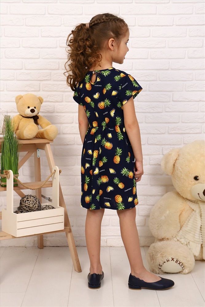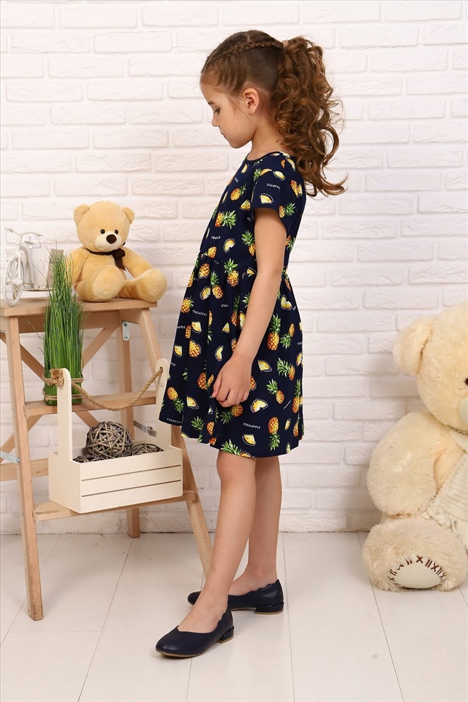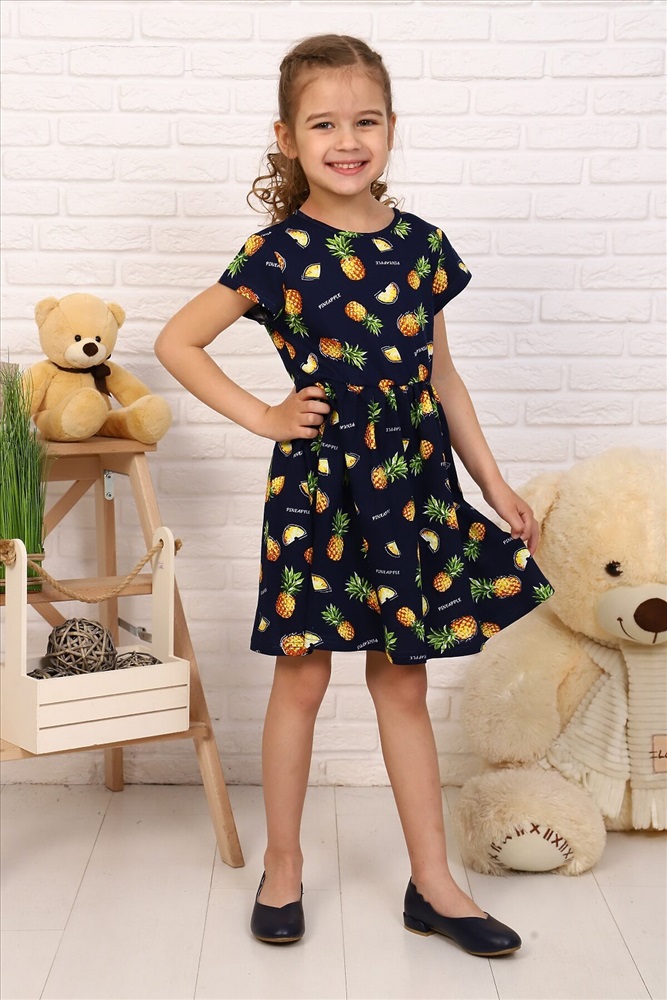 ID товара: 881964 Состав: 100% Хлопок Сезон: Весна/Лето Длина: До колена Фасон: Расклешенное Рукав: короткие Вид застежки: Пуговица Вырез горловины: Округлый Рисунок: Фрукты Декоративные элементы: Принт Основная ткань: Кулирка Стиль: повседневный Страна бренда: Россия Страна производства: Россия Платье в детский сад или на прогулку для девочек дошкольного и младшего школьного возраста, из трикотажного полотна кулирная гладь с рисунком. Платье полуприлегающего силуэта, отрезное и расширенное от линии талии, с втачным рукавом, с центральной застежкой на петлю и пуговицу сзади. На верхней части спинки вырез в виде капельки под застежку. Рукав короткий. Низ рукава и изделия подогнуты. Горловина и капелька на спинке окантованы. Комментарии к товару