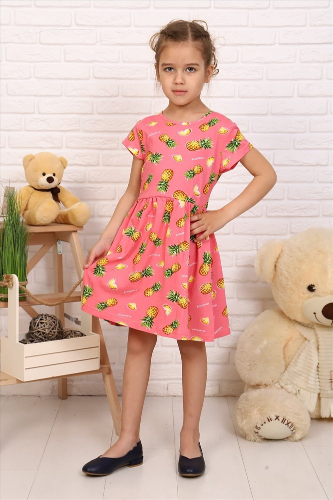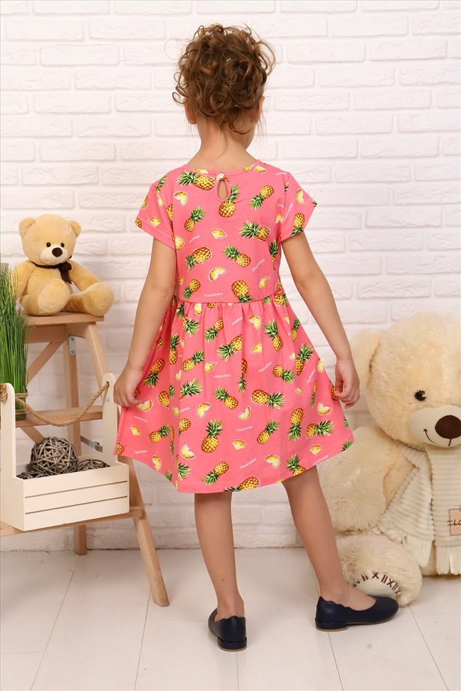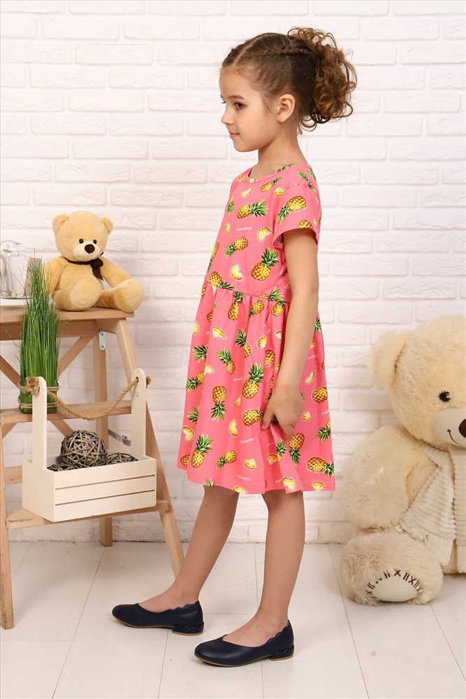 Страна производства: Россия Платье в детский сад или на прогулку для девочек дошкольного и младшего школьного возраста, из трикотажного полотна кулирная гладь с рисунком. Платье полуприлегающего силуэта, отрезное и расширенное от линии талии, с втачным рукавом, с центральной застежкой на петлю и пуговицу сзади. На верхней части спинки вырез в виде капельки под застежку. Рукав короткий. Низ рукава и изделия подогнуты. Горловина и капелька на спинке окантованы.