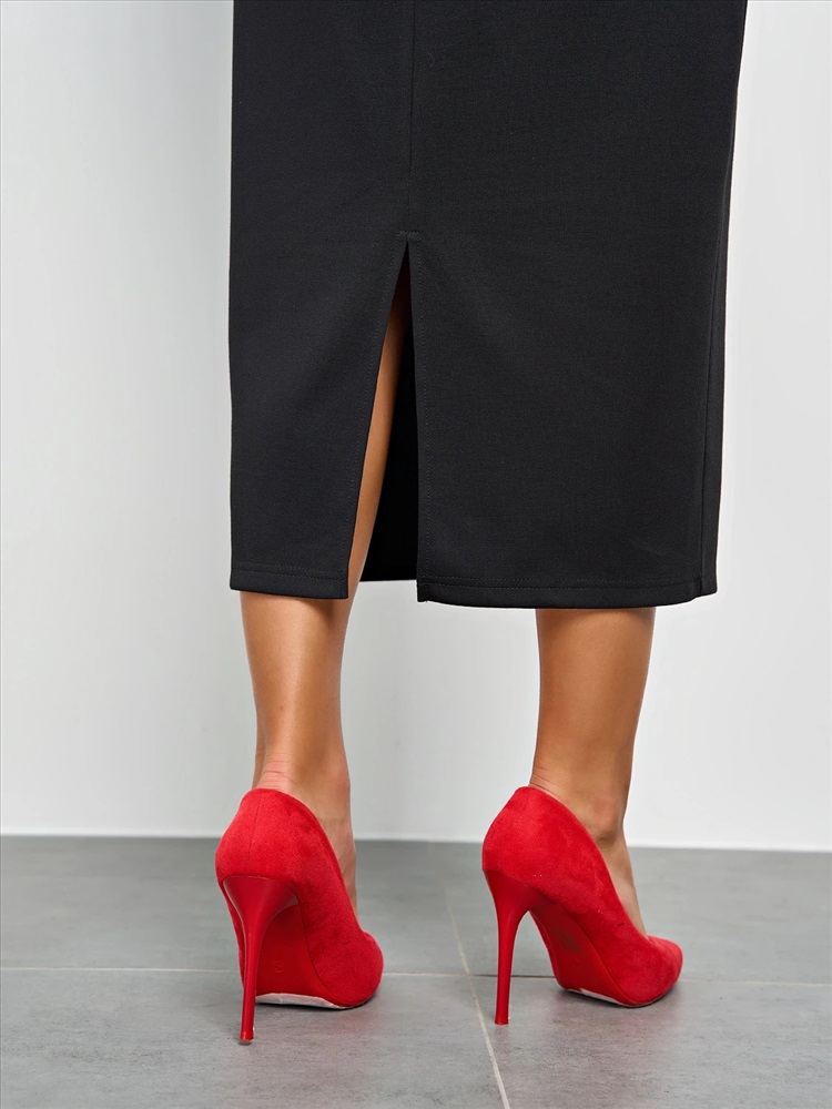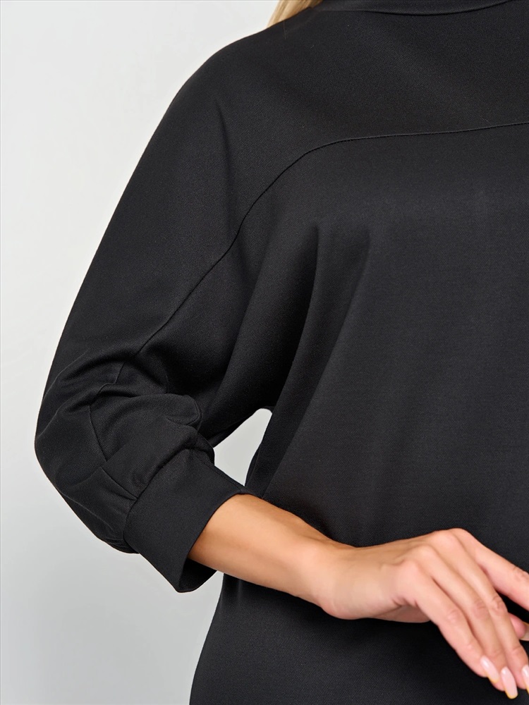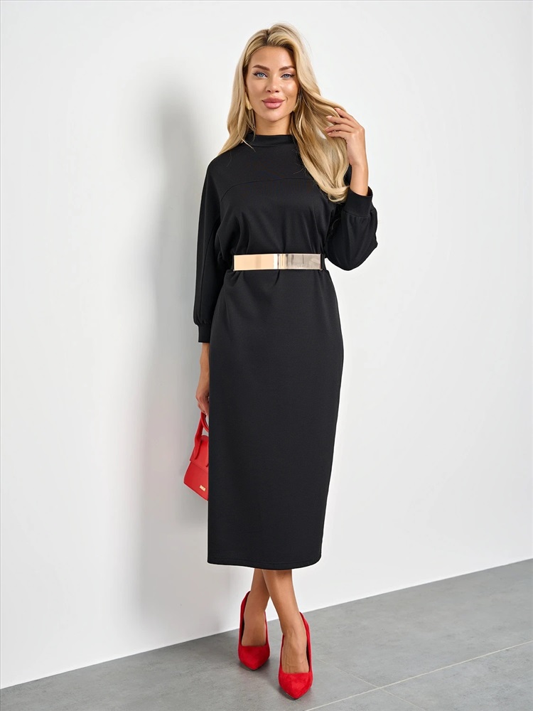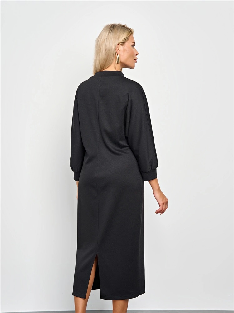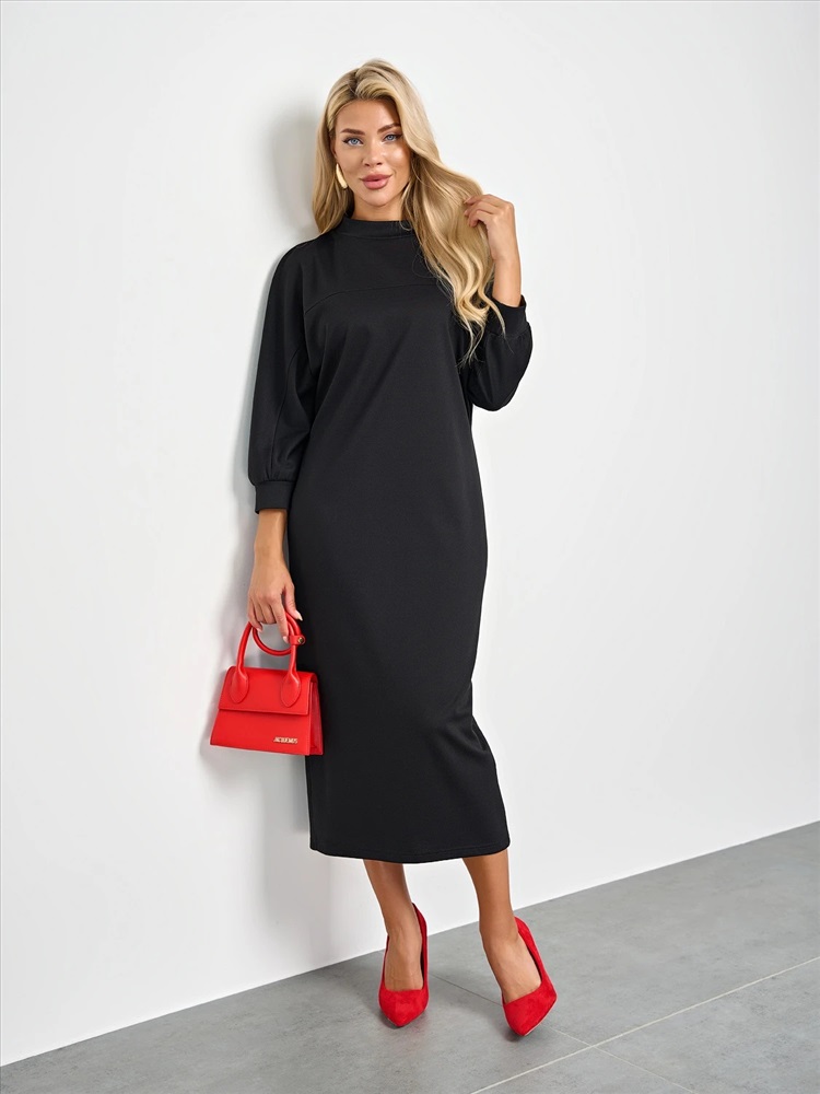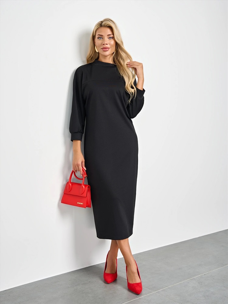 Мягкое трикотажное платье с воротником стойкой прямого кроя.