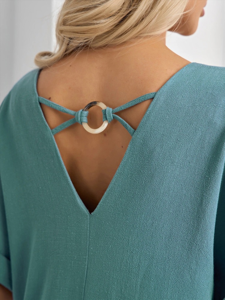 V-образный вырез горловины по переду и спинке. На спинке декоративный элемент - кольцо. Цельнокроеный рукав с отворотом. Ткань усадочная, садится после стрики, степень усадки заложена при крое. Комментарии к товару