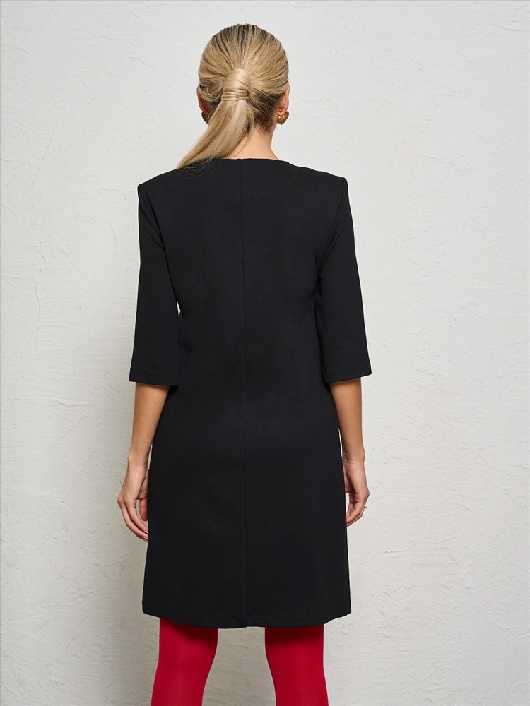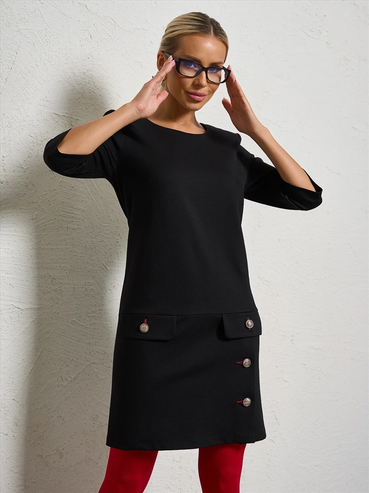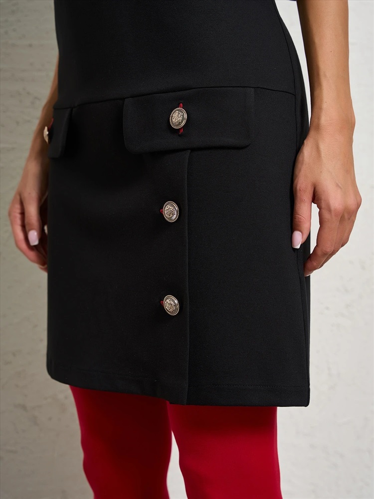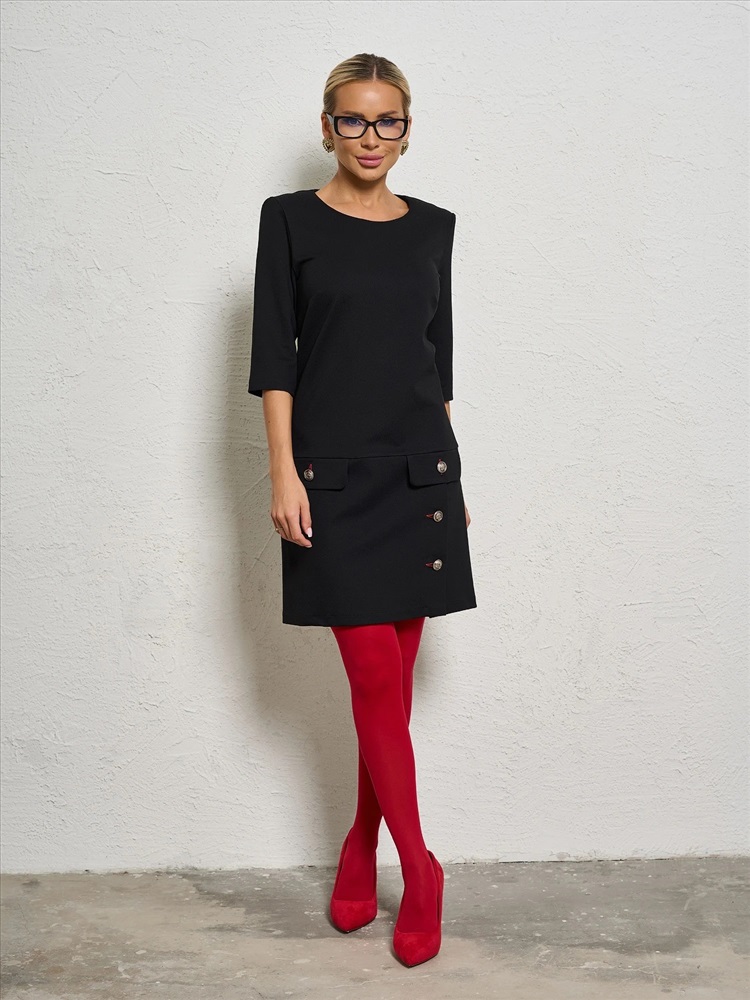 По нижней части платья расположены клапаны с декоративными пуговицами и разрез.