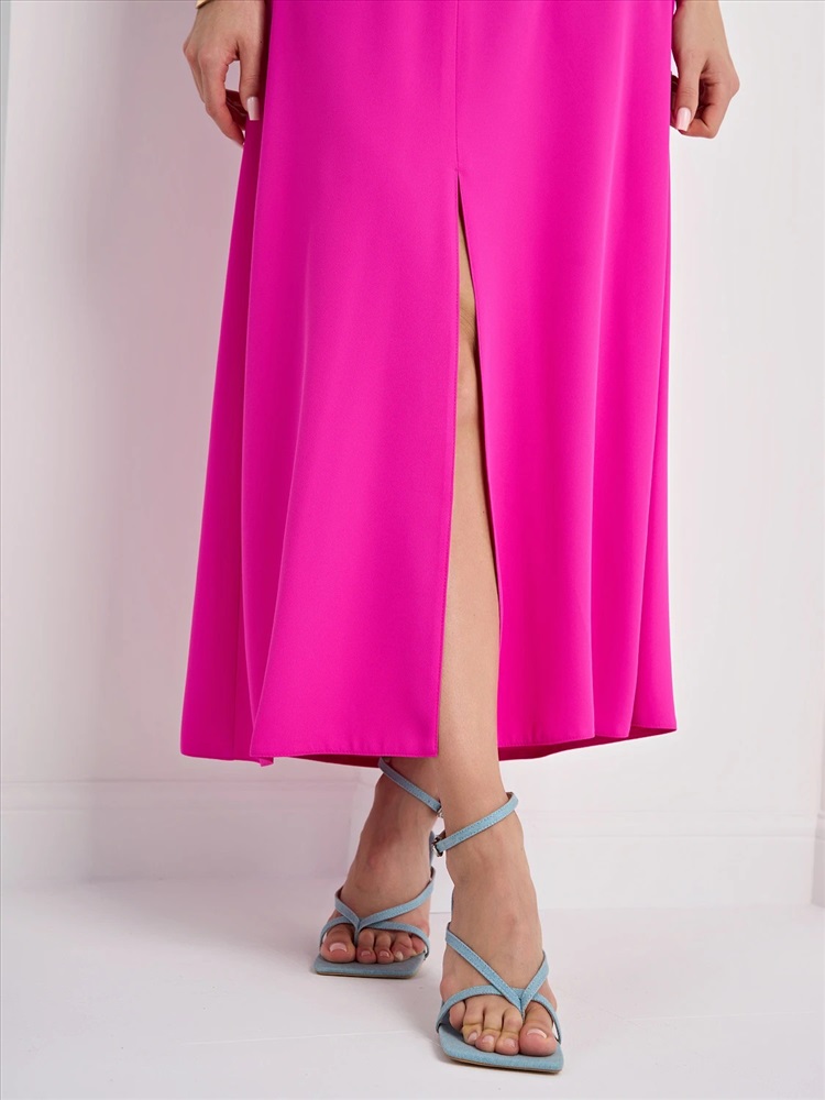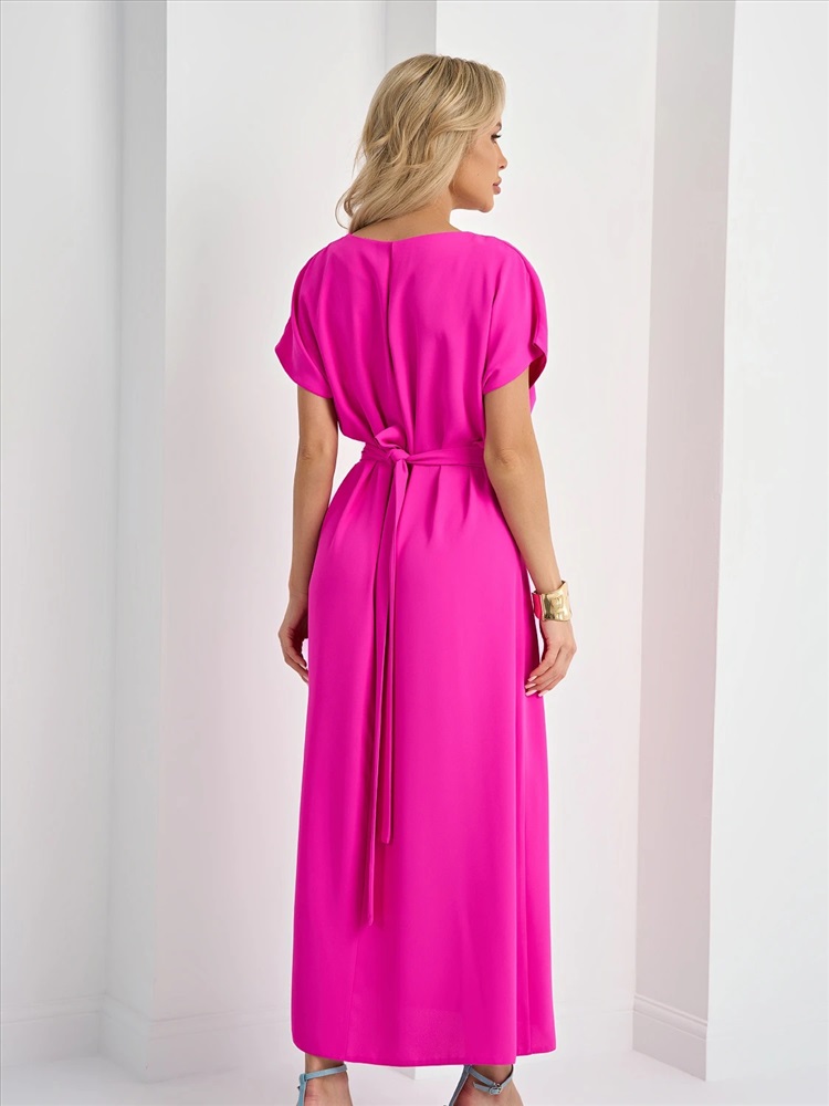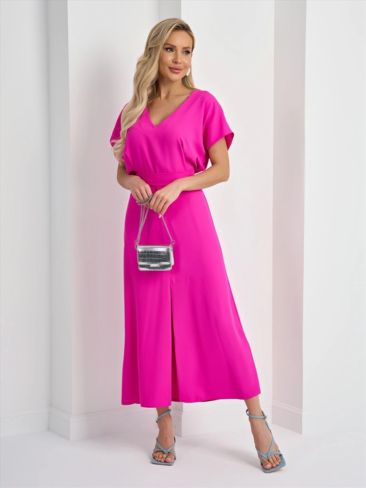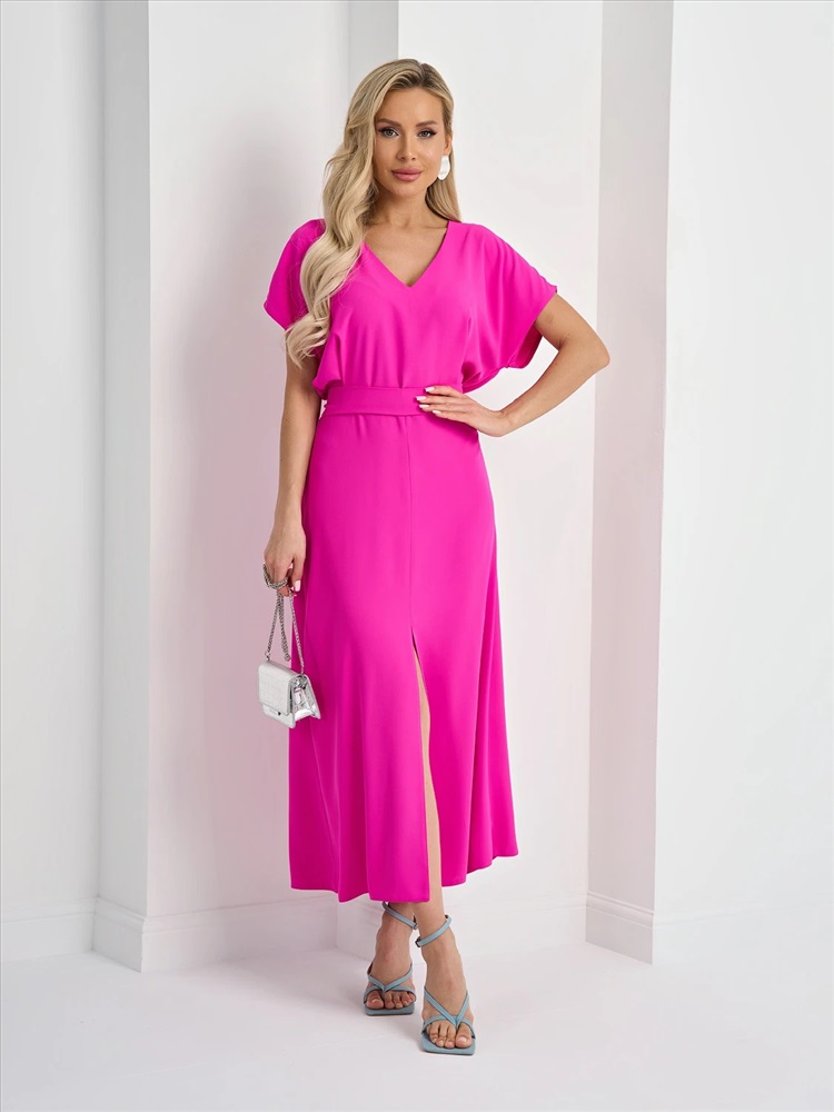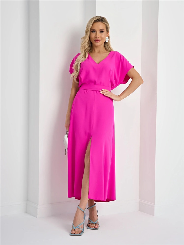 Спинка со средним швом и защипом по центру горловины. Короткий спущенный рукав. V-образный вырез. Разрез спереди. Длина миди. Комментарии к товару