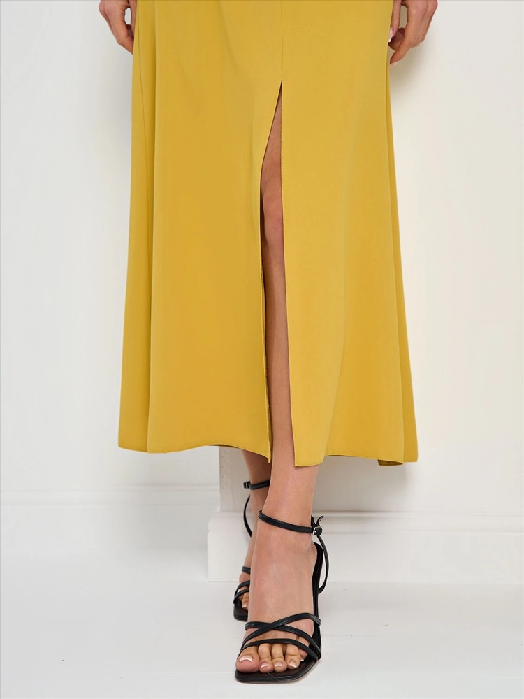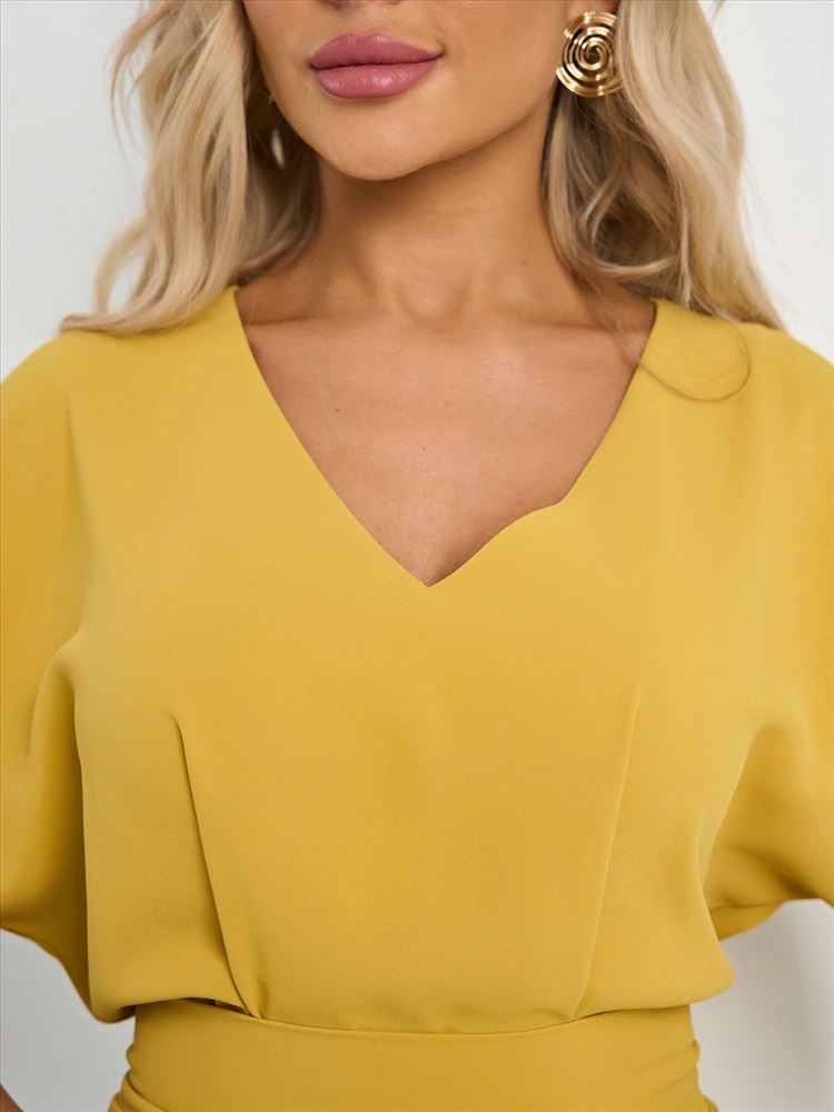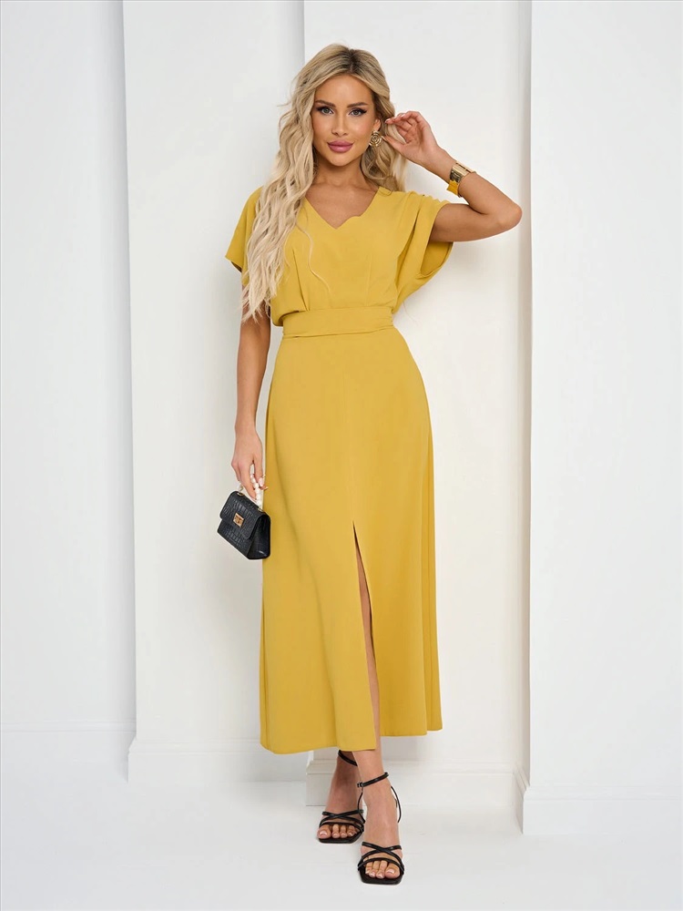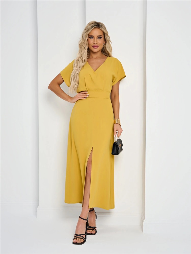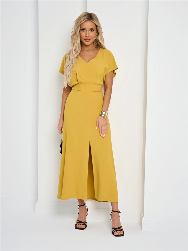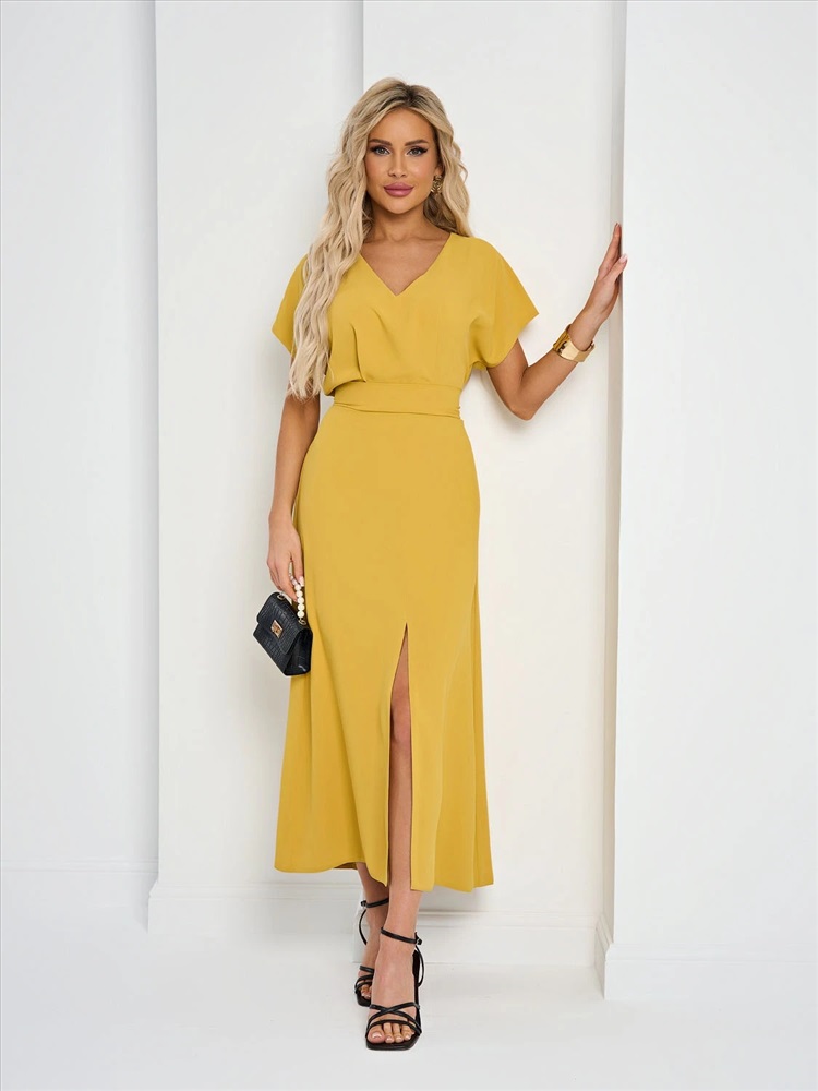 Спинка со средним швом и защипом по центру горловины. Короткий спущенный рукав. V-образный вырез. Разрез спереди. Длина миди. Комментарии к товару