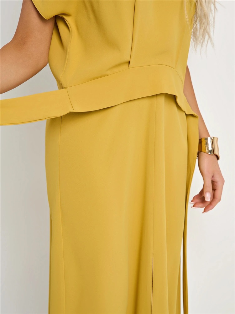 Платье с отрезной талией по переду, в шов вшит широкий пояс, который завязывается сзади.