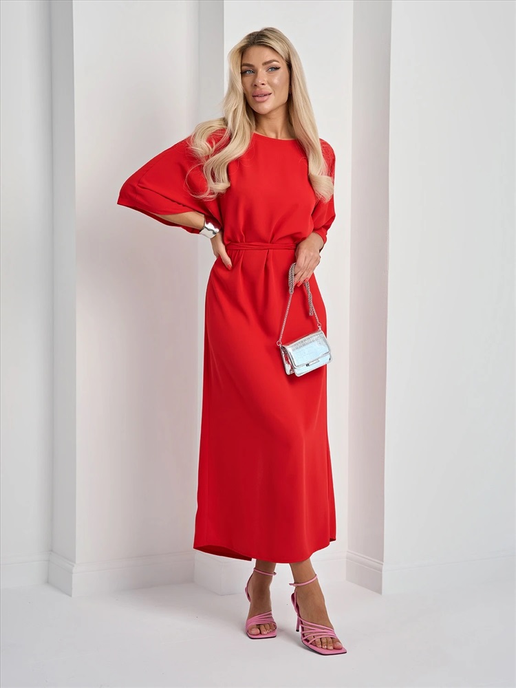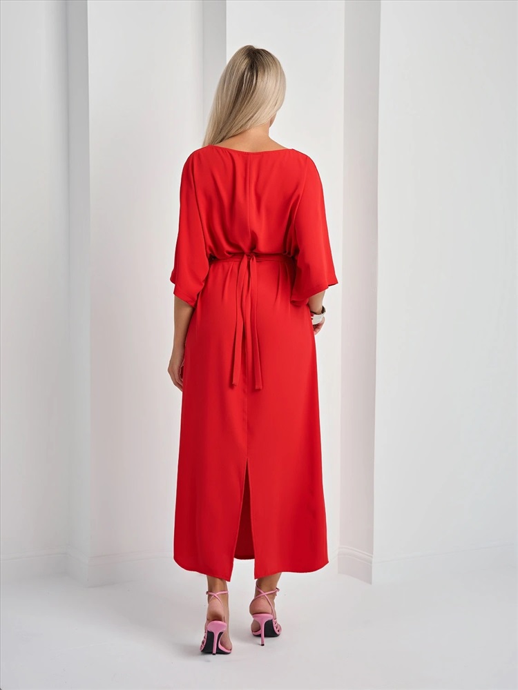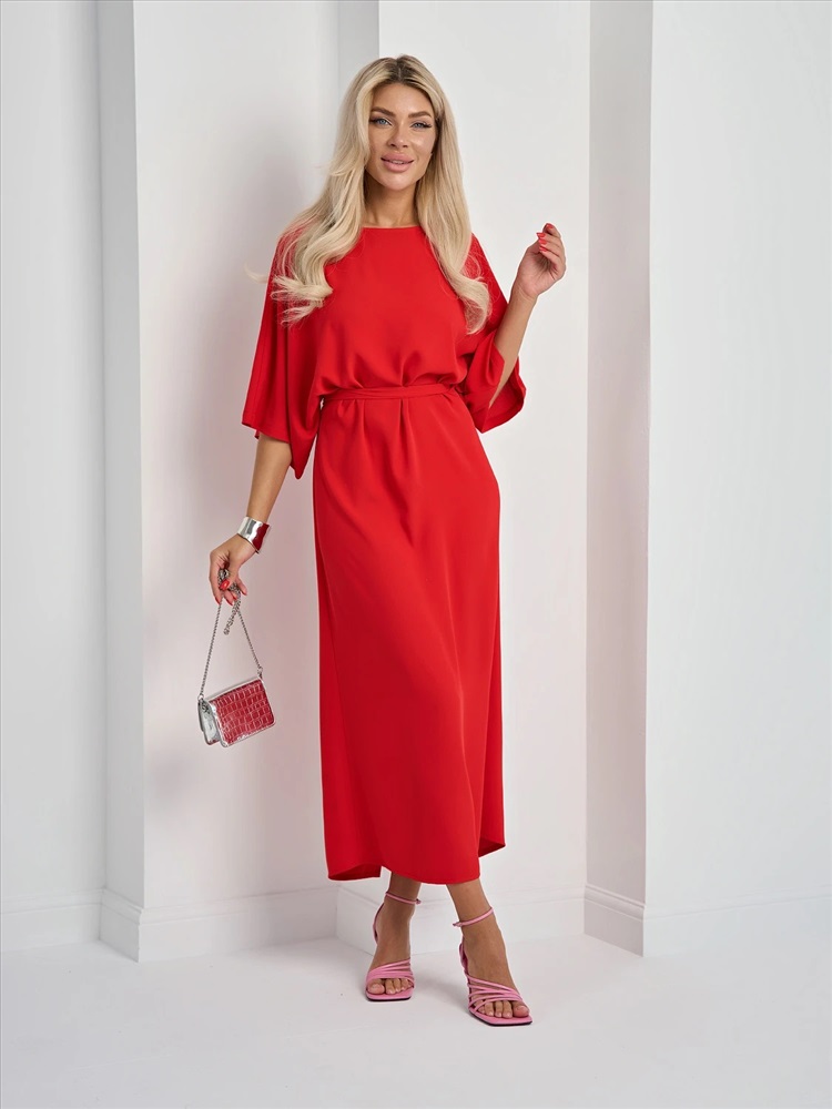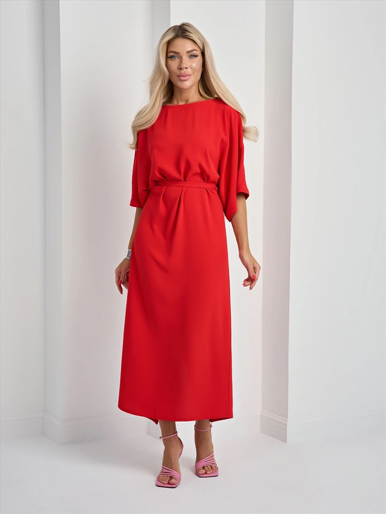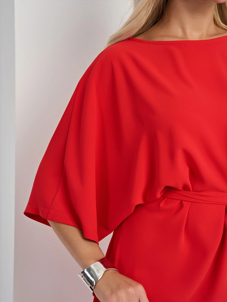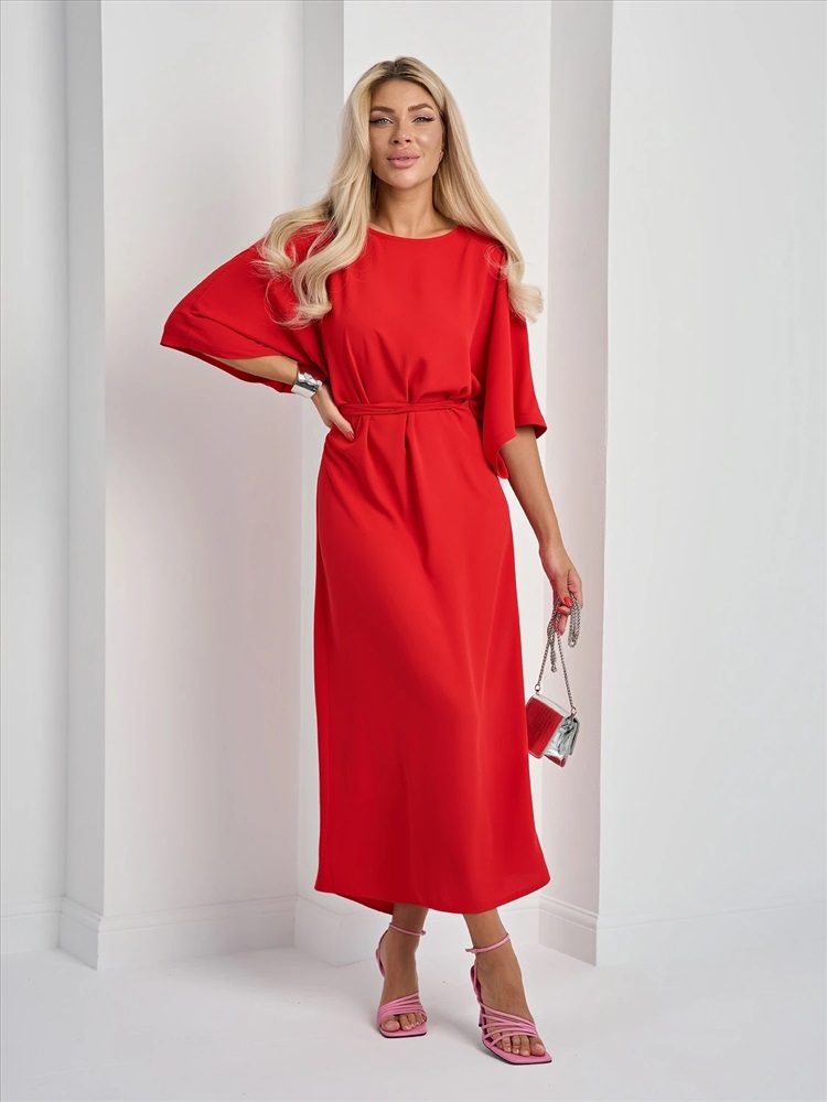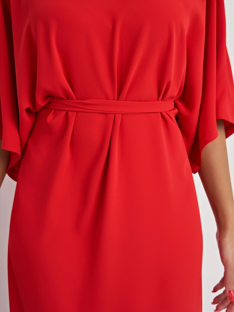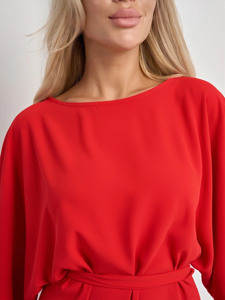 Талия декорирована вшивным поясом из основной ткани. Спинка изделия со средним швом и шлицей сзади. Короткий цельнокроеный рукав. Комментарии к товару