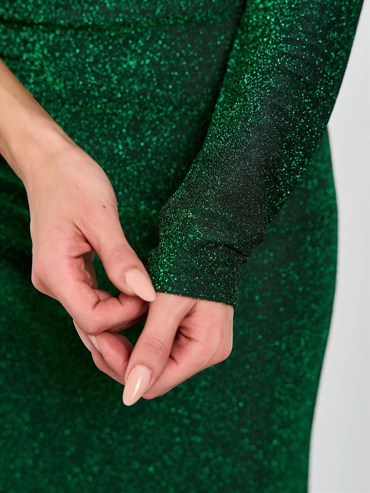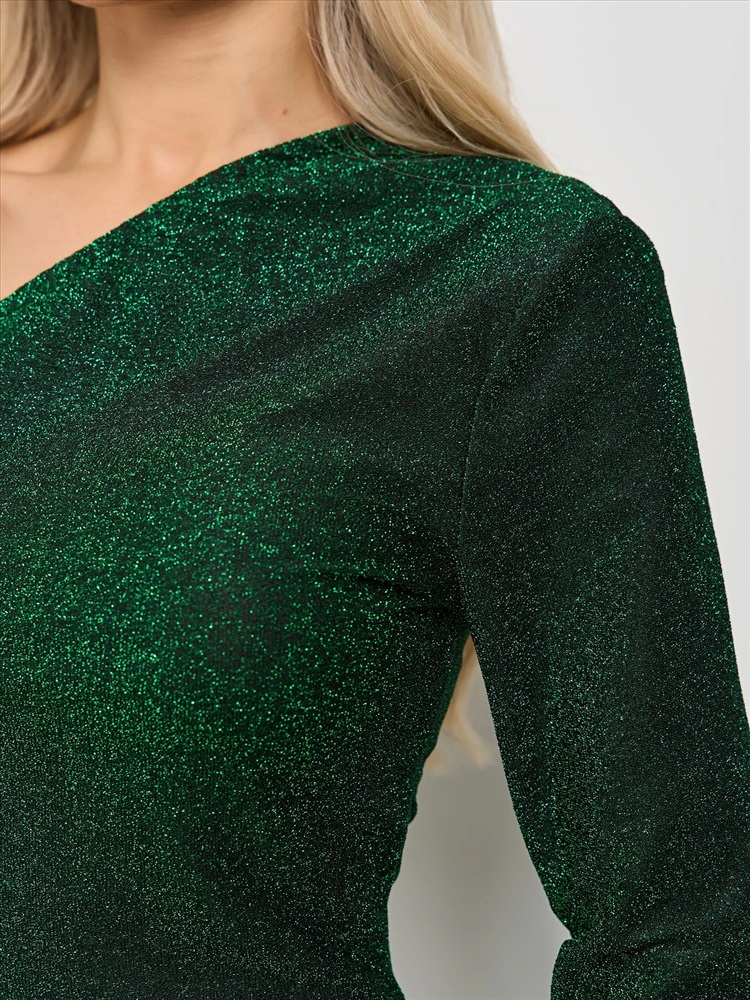 Элегантное платье прилегающего силуэта из эластичного трикотажа с люрексом на одно плечо с одним длинным рукавом.