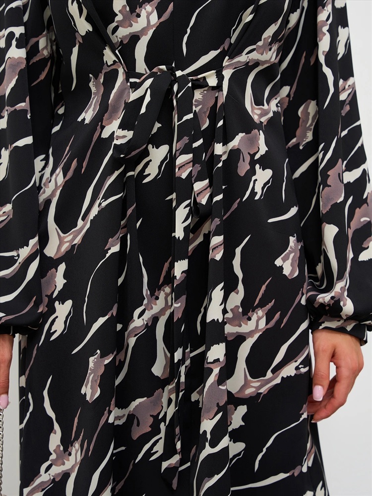 Перед и спинка со средним швом. Длинный рукав на узкой манжерет. V-образный вырез горловины. По переду изделия расположены вытачки, в которые вшит узкий пояс, завязывающийся спереди или сзади. Комментарии к товару