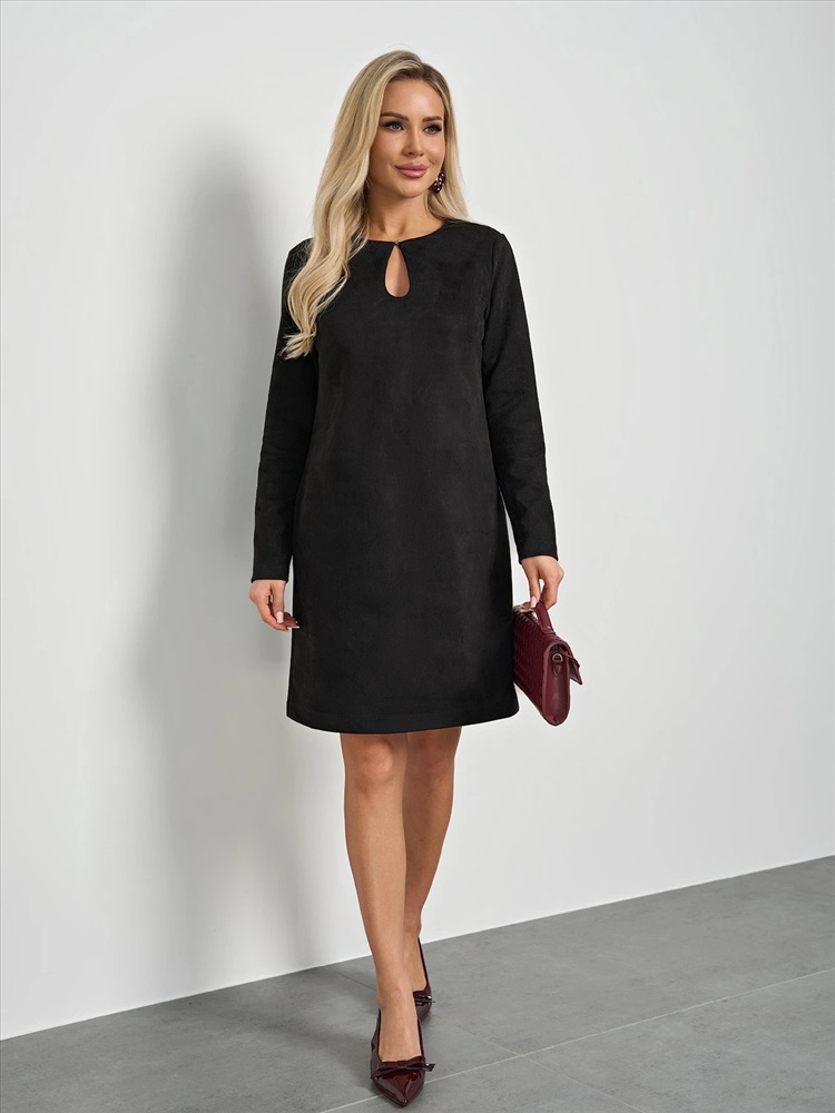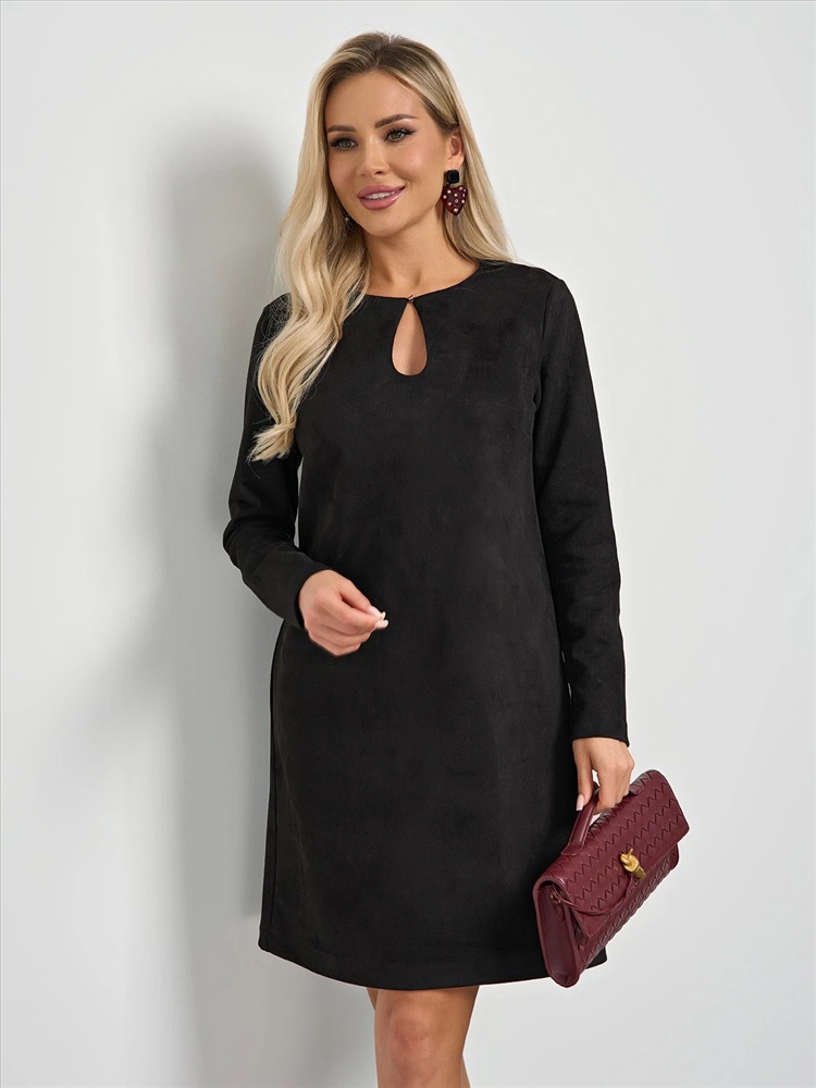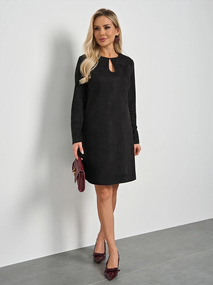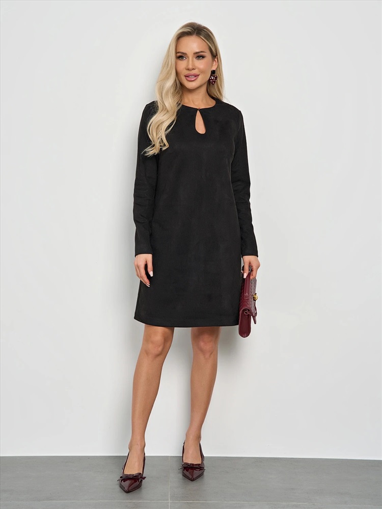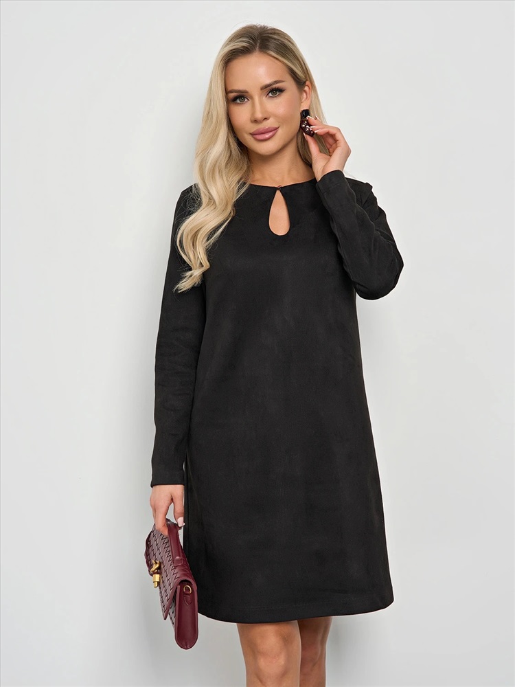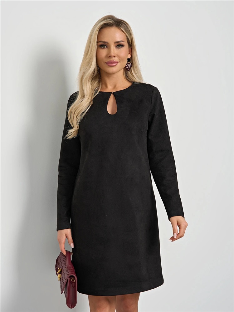 В верхней части переда расположен разрез в виде капли, который фиксируется застежкой на петлю и пуговицу.