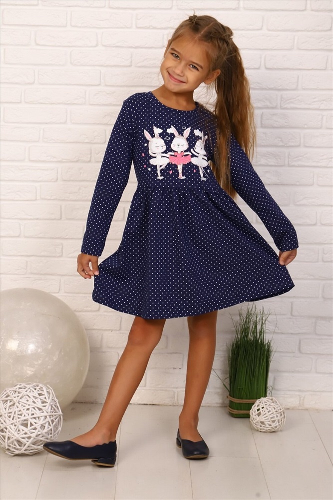 Страна производства: Россия Платье для девочек дошкольного и младшего школьного возраста, из трикотажного полотна кулирка с лайкрой с рисунком. Платье прилегающего силуэта, отрезное и расклешенное от линии талии, с втачным длинным одношовным рукавом, с обтачкой в горловине. Низа рукавов и нижней части платья подогнуты. По шву втачивания обтачки в горловину проложена отделочная строчка. Спереди на верхней части платья нанесен печатный рисунок.