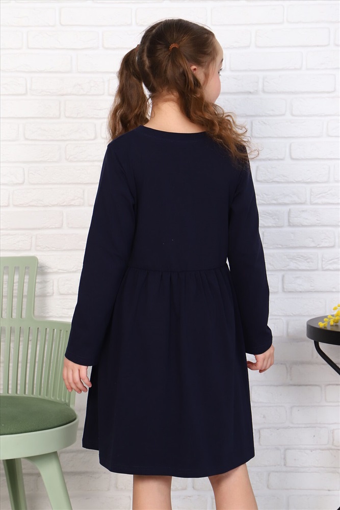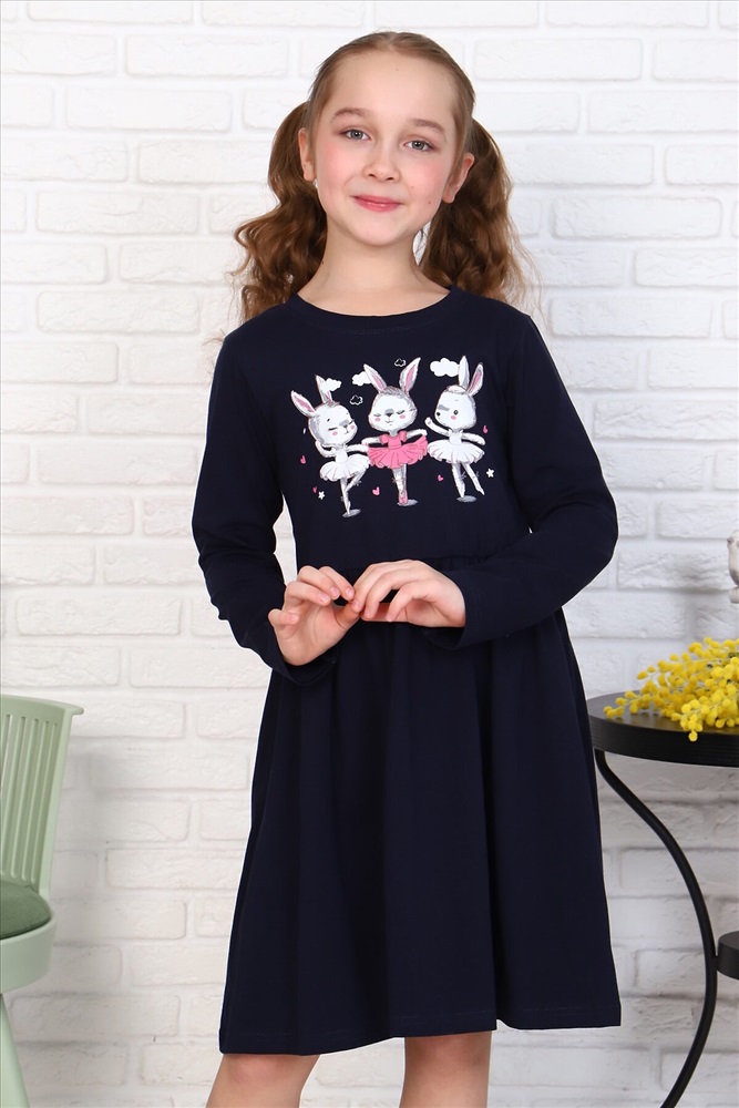 Страна производства: Россия Платье для девочек дошкольного и младшего школьного возраста, из трикотажного полотна кулирка с лайкрой с рисунком. Платье прилегающего силуэта, отрезное и расклешенное от линии талии, с втачным длинным одношовным рукавом, с обтачкой в горловине. Низа рукавов и нижней части платья подогнуты. По шву втачивания обтачки в горловину проложена отделочная строчка. Спереди на верхней части платья нанесен печатный рисунок.