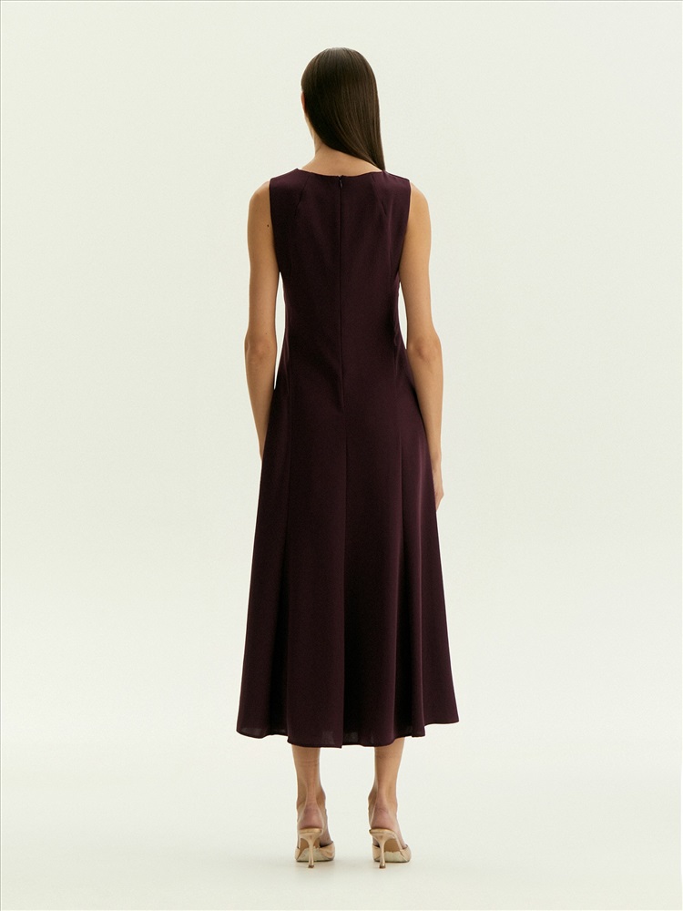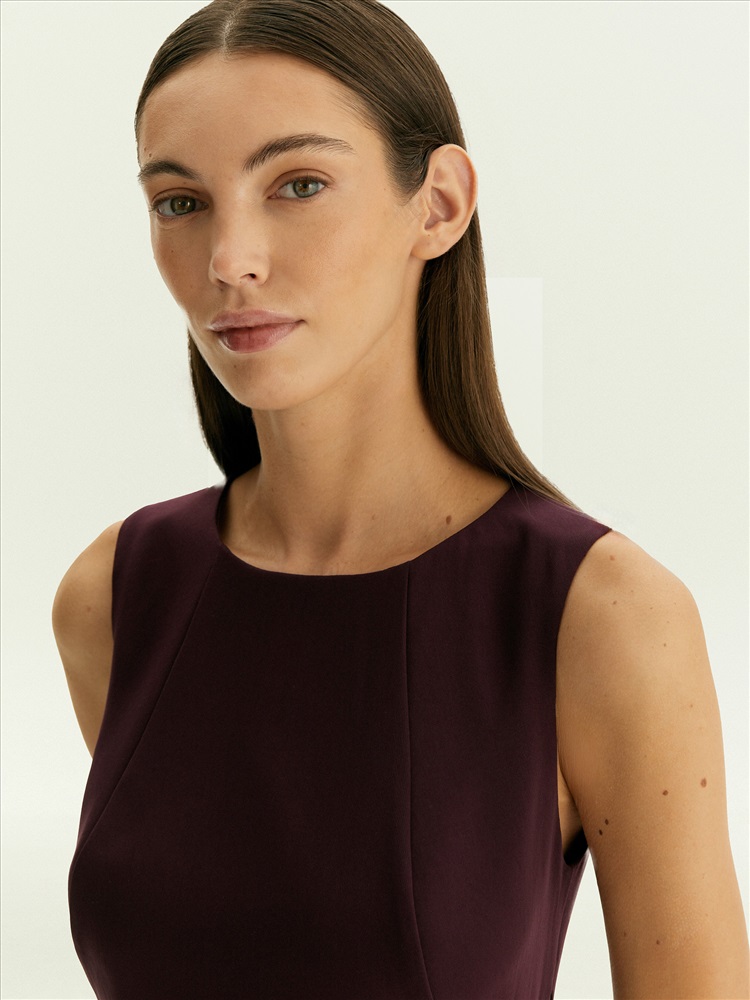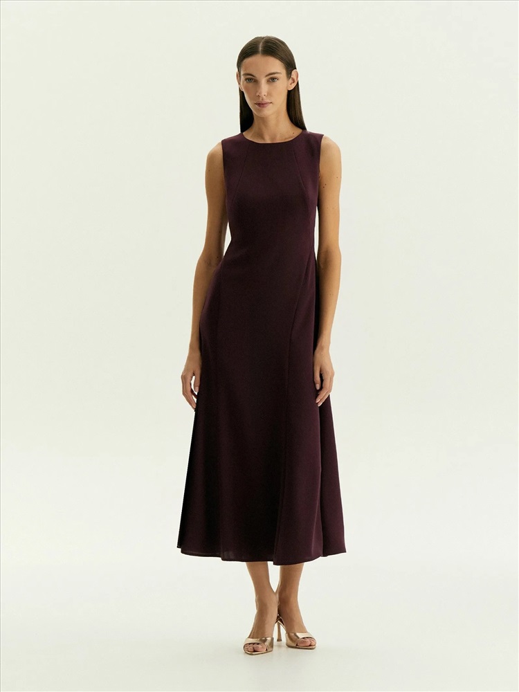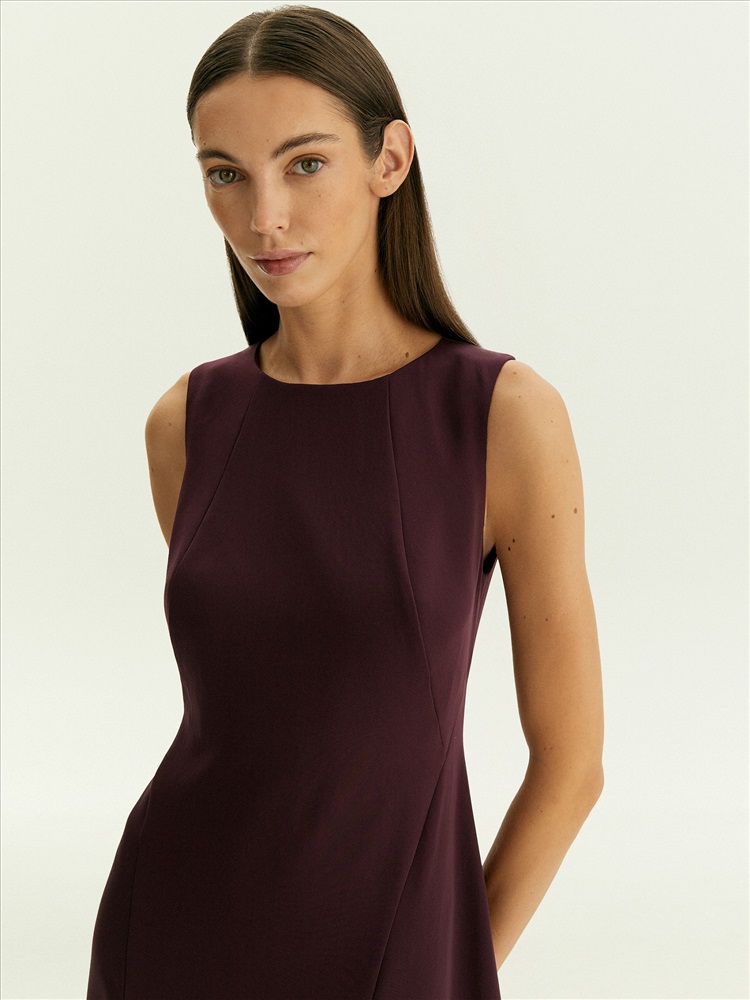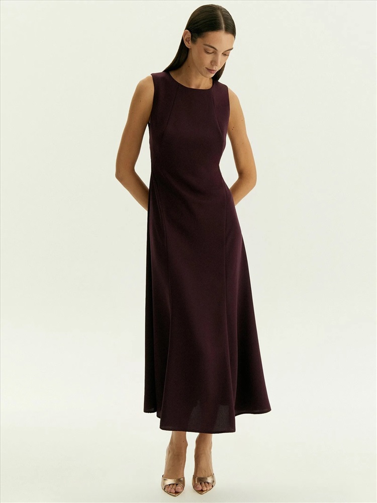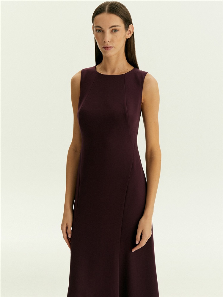 Платье мидакси без рукавов подойдёт на каждый день и к особым случаям. Отличный вариант для образов с тонкими лонгсливами из сетки или жакетами. Рельефы визуально сужают области бёдер и плеч, а в нижней части платья также создают более динамичную конструкцию платья, которая эффектно раскрывается в движении. Цвет инжира — среди ключевых в новом сезоне; он делает образ актуальным, дорого и благородно выглядит, органично вписывается в деловой дресс-код. Платье выполнено без подкладки.