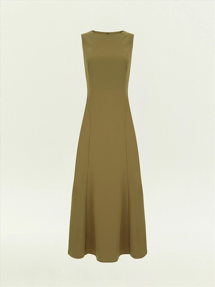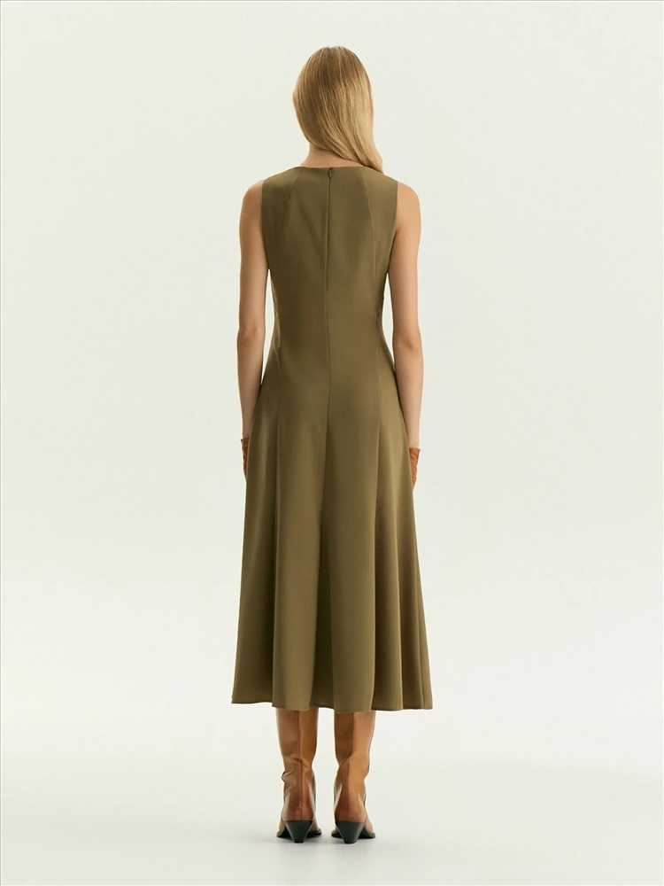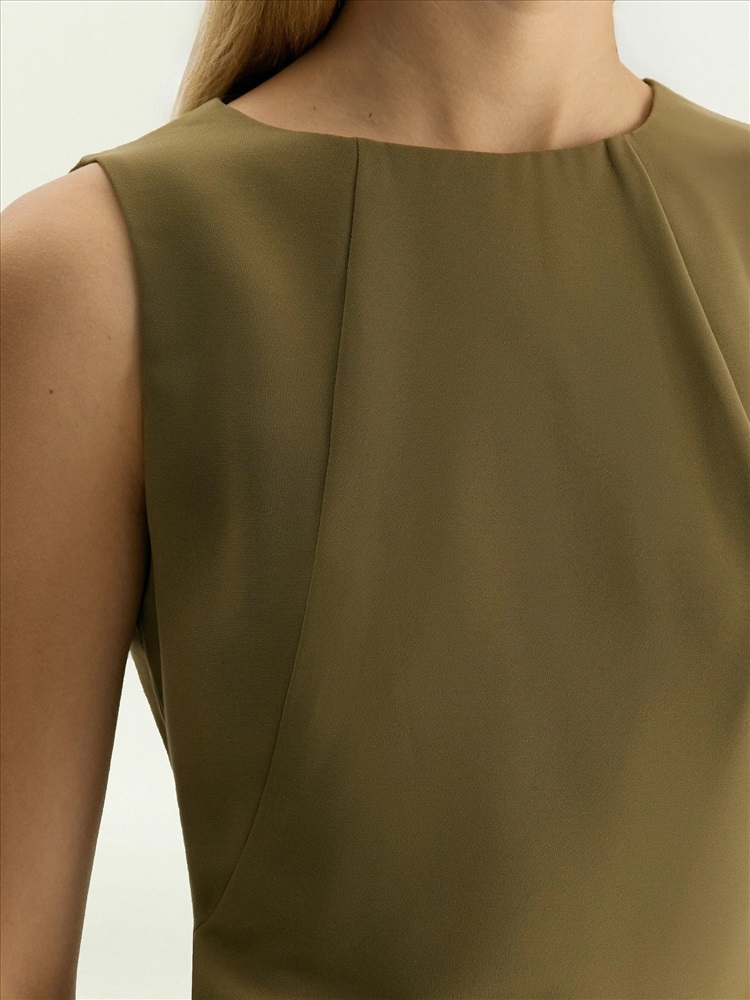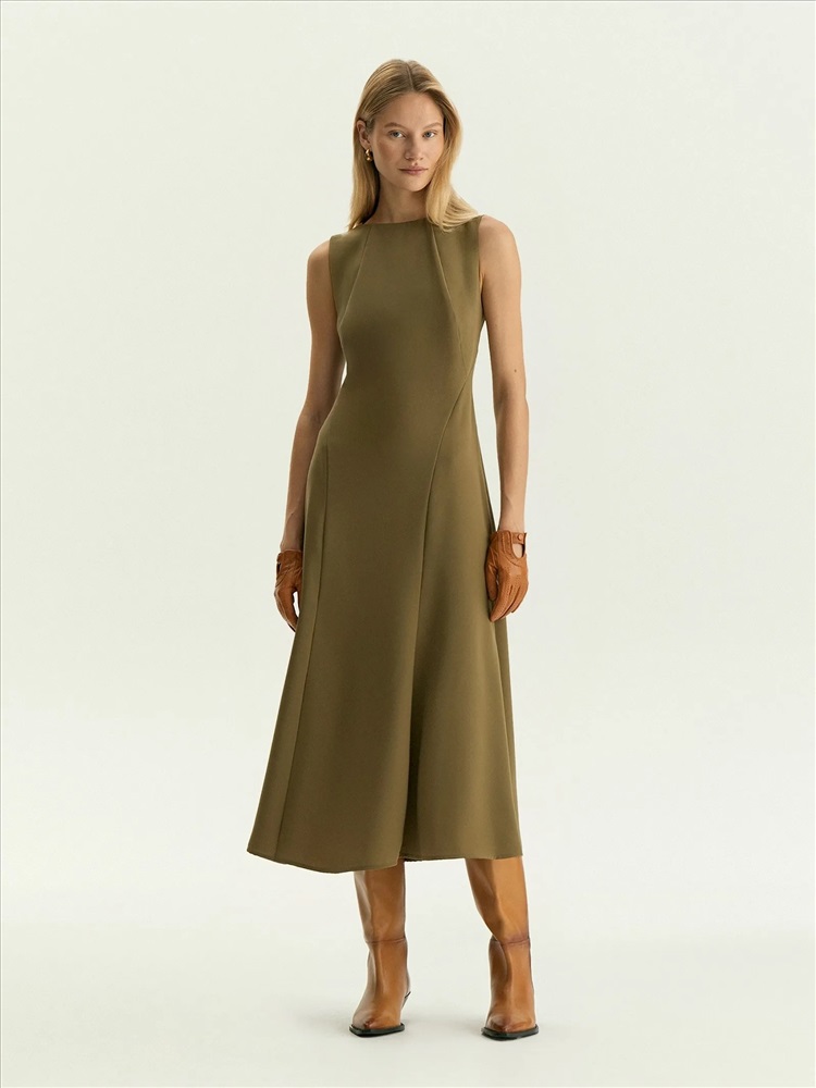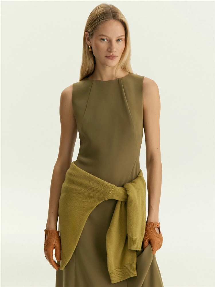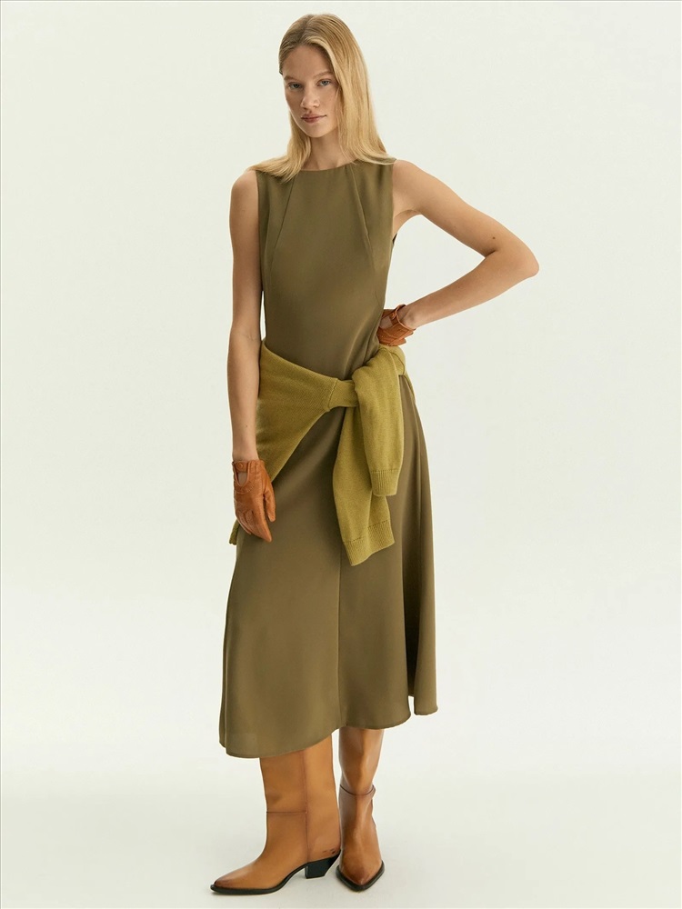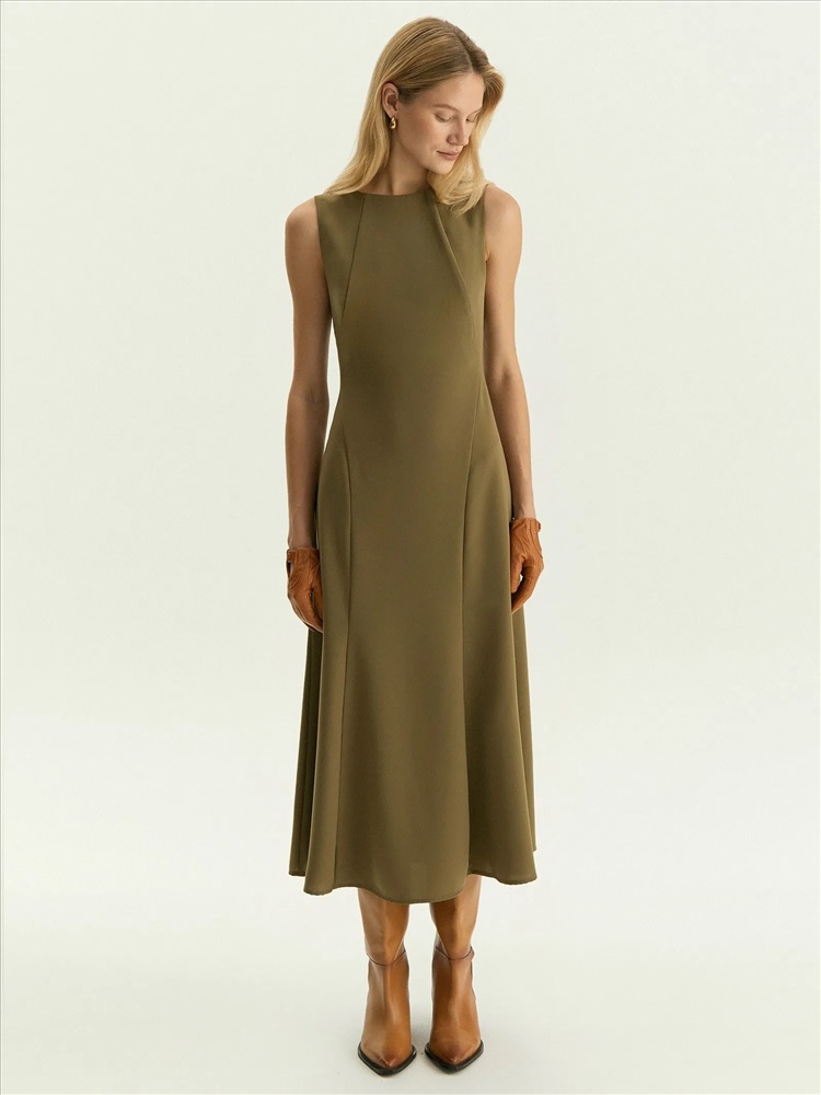 Платье мидакси без рукавов подойдёт на каждый день и к особым случаям. Отличный вариант для образов с тонкими лонгсливами из сетки или жакетами. Рельефы визуально сужают области бёдер и плеч, а в нижней части платья также создают более динамичную конструкцию платья, которая эффектно раскрывается в движении. Цвет оливки — среди ключевых в новом сезоне; он делает образ актуальным, дорого и благородно выглядит, органично вписывается в деловой дресс-код. Платье выполнено без подкладки.