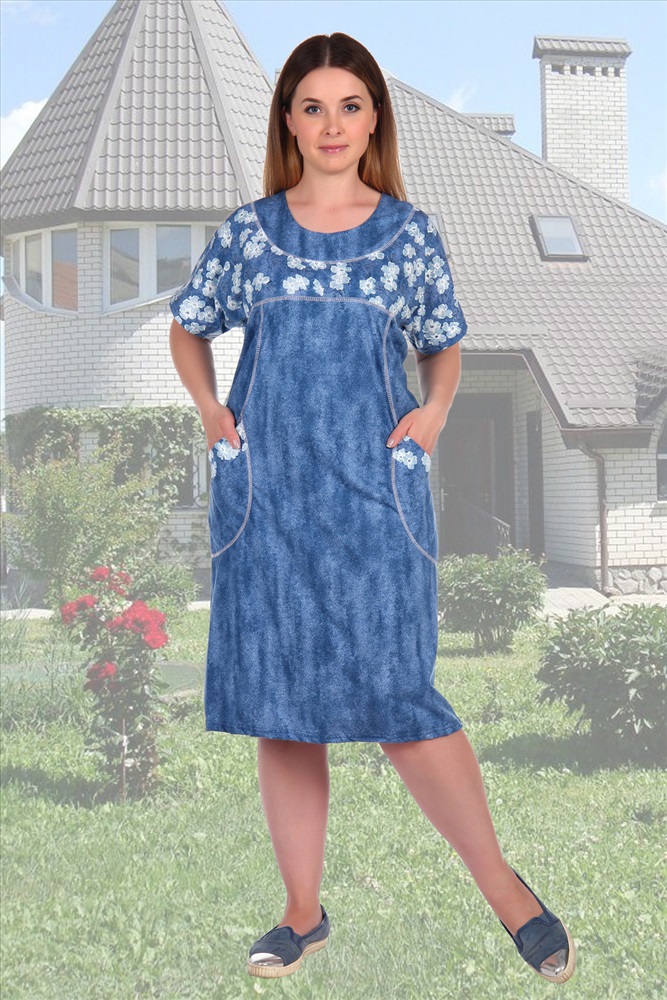 Застежка: без застежки Стильное женское платье из кулирки. Свободный покрой со спущенным плечом и накладными карманами, рукава короткие, два варианта дизайна белые либо розовые цветы, общая длина чуть ниже коленей