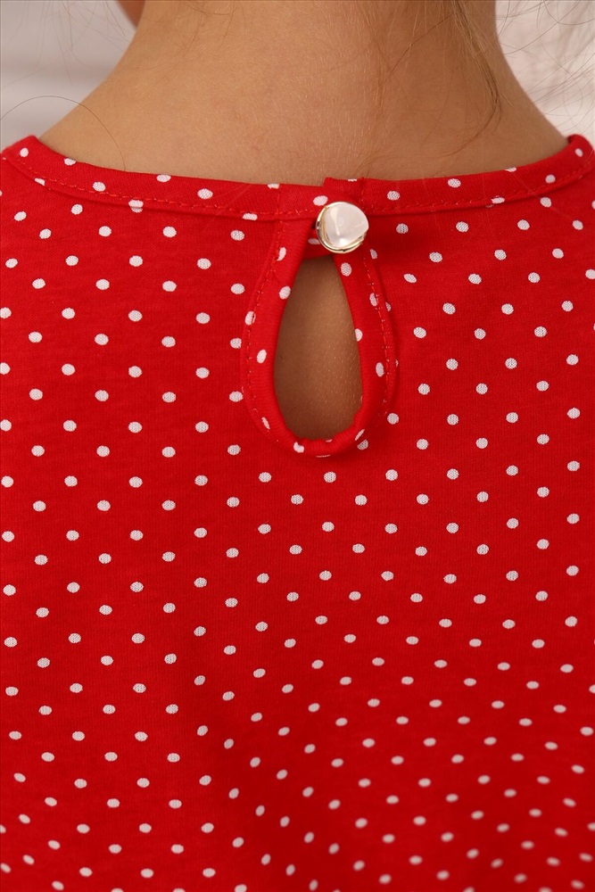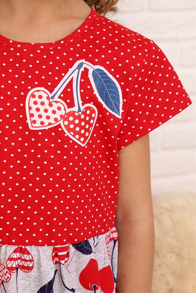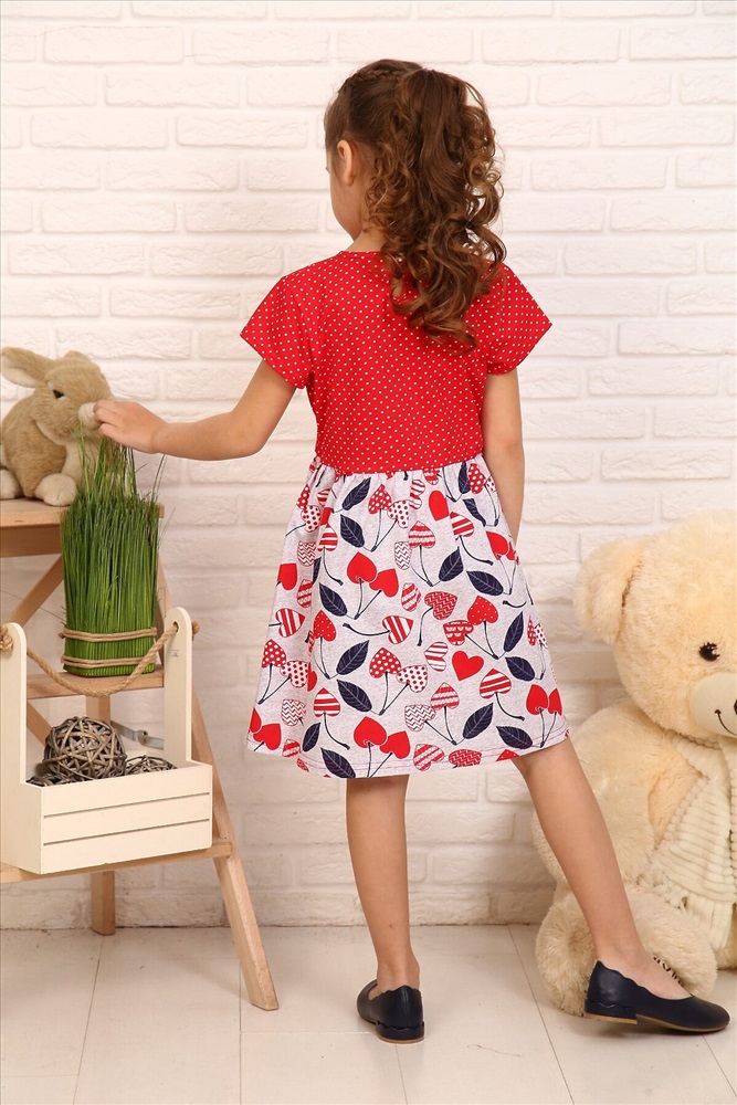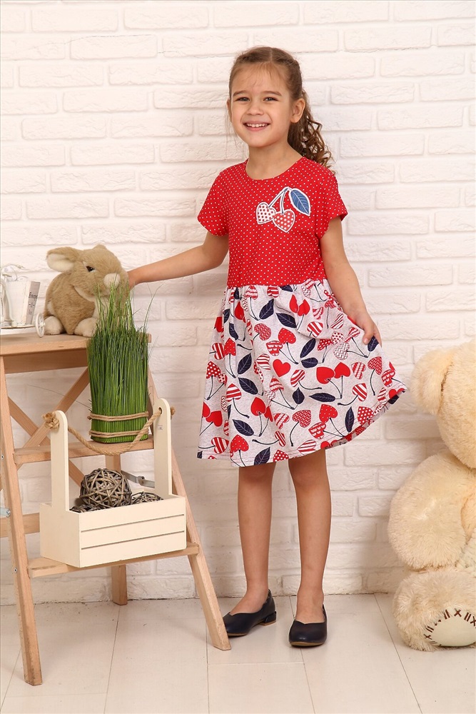 Платье в детский сад или на прогулку для девочек дошкольного и младшего школьного возраста, из трикотажного полотна кулирная гладь с рисунком. Платье полуприлегающего силуэта, отрезное и расширенное от линии талии, с втачным рукавом, с центральной застежкой на петлю и пуговицу сзади. Верхние части переда и спинки и рукав с рисунком горох, нижние части переда и спинки с рисунком черешня. На верхней части спинки вырез в виде капельки под застежку. Рукав короткий. Низ рукава и изделия подогнуты. Горловина и капелька на спинке окантованы. На верхней передней части нанесен печатный рисунок.