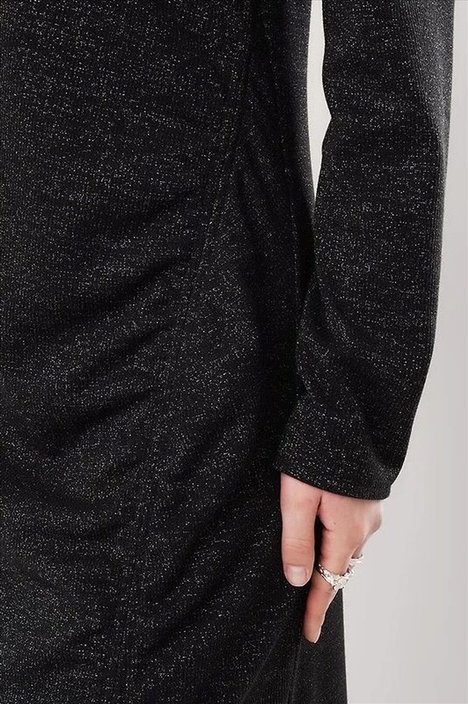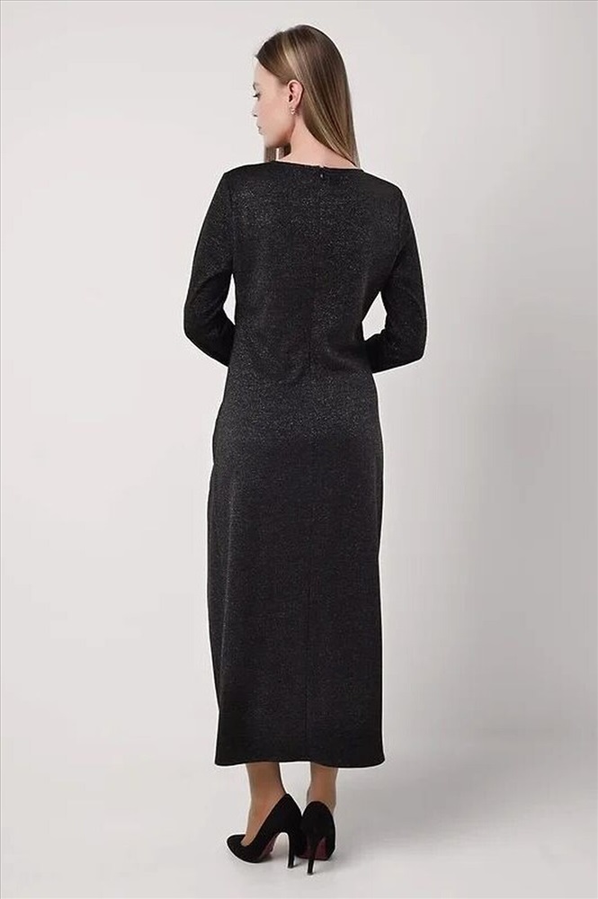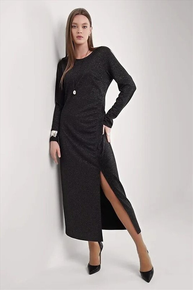 Страна производства: Россия Платье полуприлегающего силуэта из трикотажного полотна с блеском. Округлая горловина. Длинный втачной рукав, по низу рукава разрезы. По переду рельеф со сборкой на резинку и разрезом. По спинке средний шов с застёжкой на молнию.