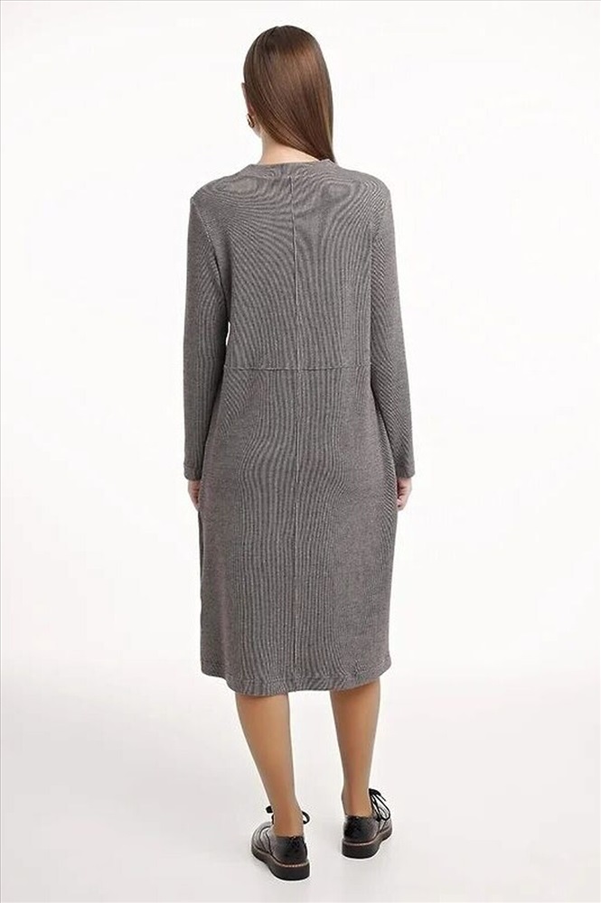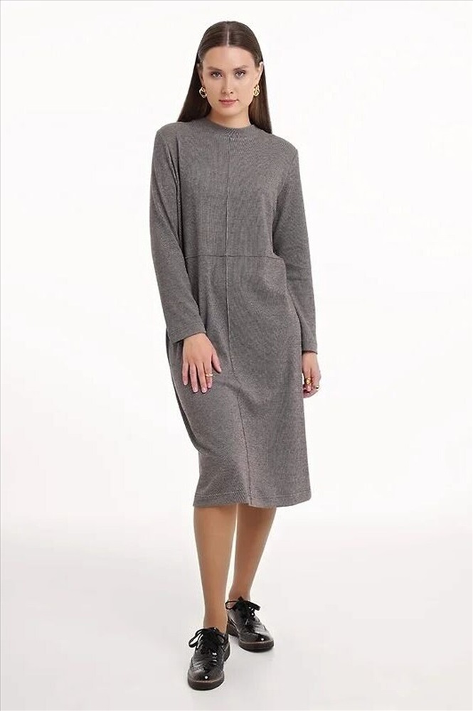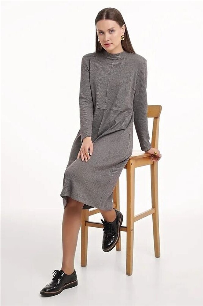 Платье прямого силуэта из трикотажного полотна рибана с вискозой. Длиной ниже колена. Округлая горловина с обтачкой. По переду и спинке вертикальные и горизонтальные защипы. Длинный втачной рукав.